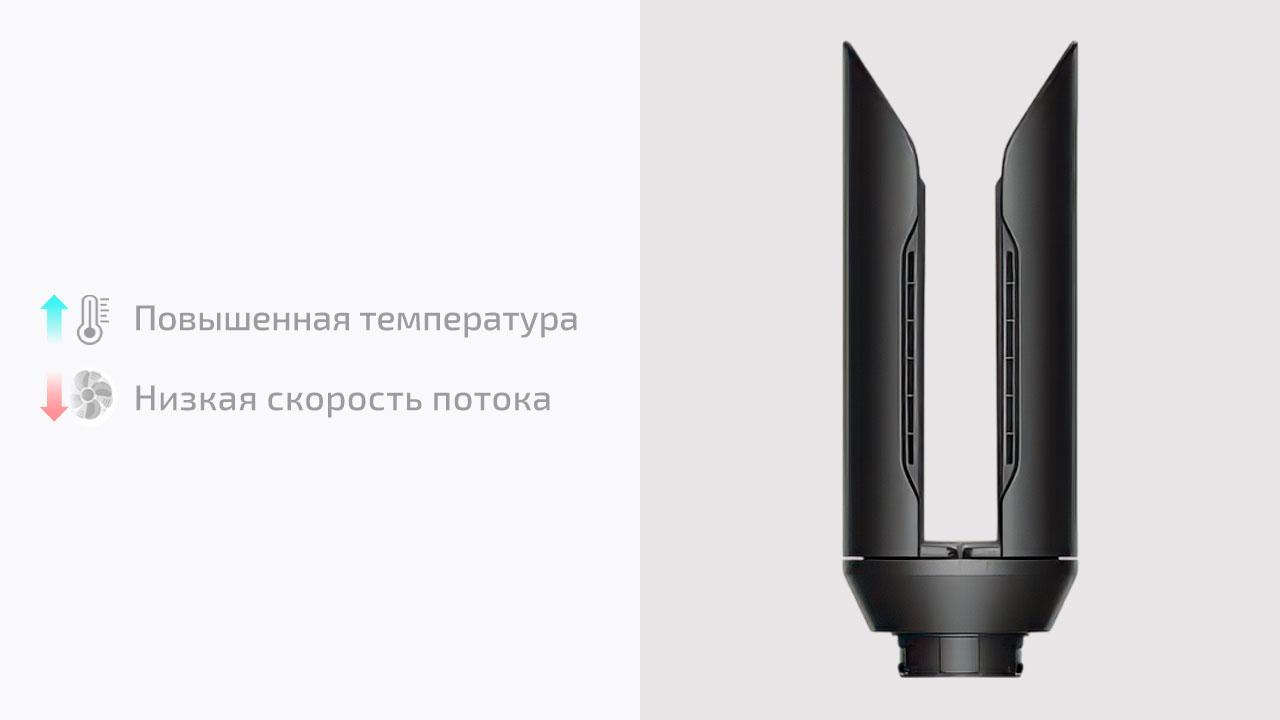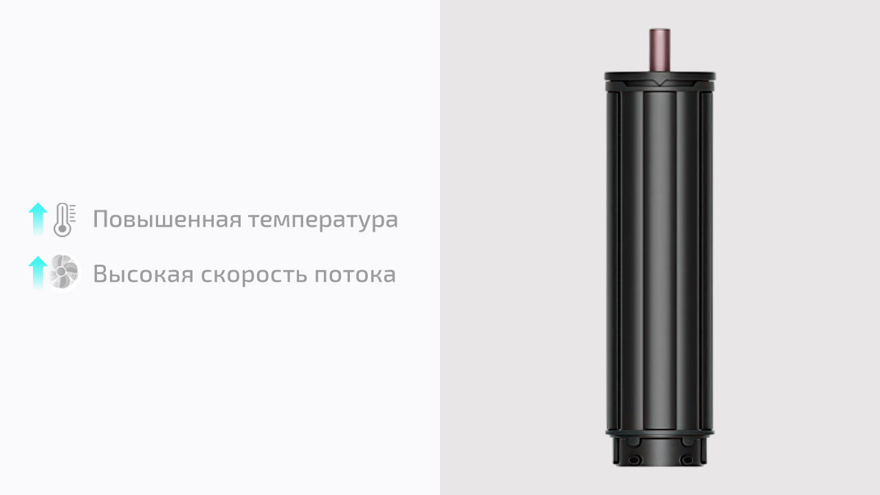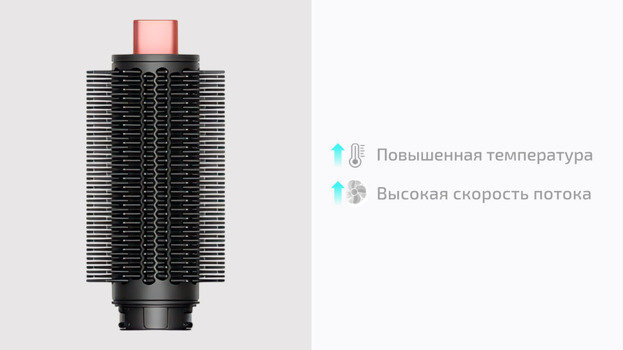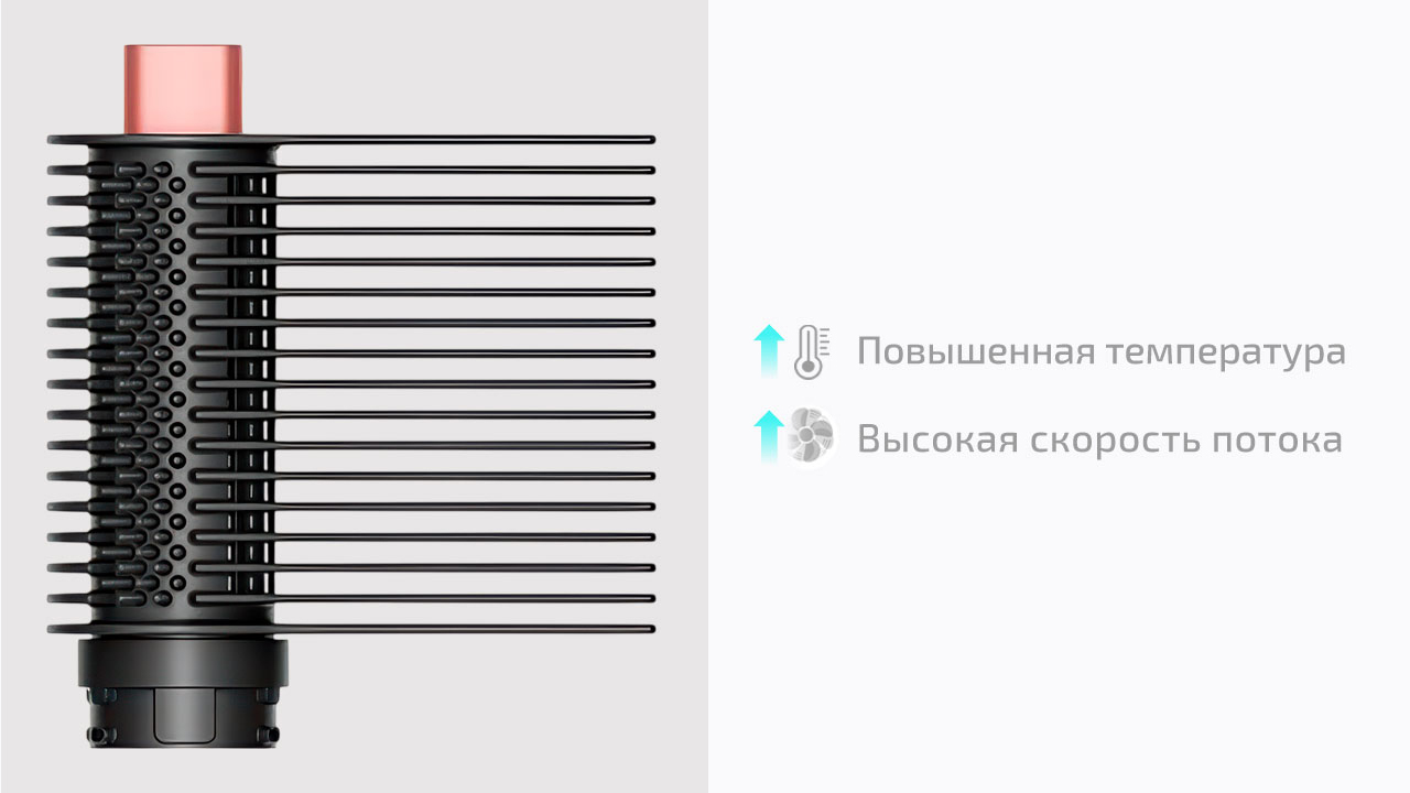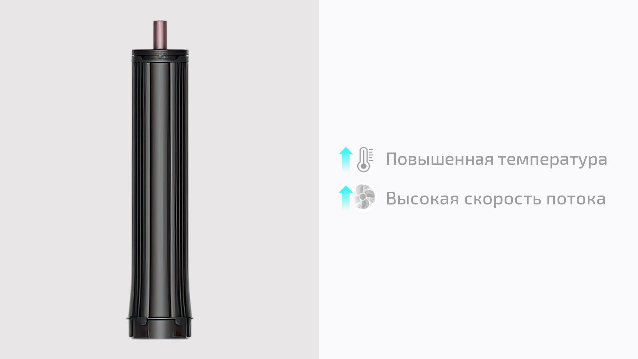 30 мм Coanda 2x создаёт мягкие локоны и объёмные волны за счёт эффекта Коанда — поток воздуха сам притягивает прядь и наматывает её на цилиндр. Длина насадки уменьшена с 18 до 14 см. Это упрощает контроль: легче работать у корней и меньше путаницы с длинными прядями. Одна насадка работает в двух направлениях — переключение вместо замены. Локоны формируются быстрее за счёт усиленного потока воздуха, без перегрева. Входит только в Straight+Wavy.
