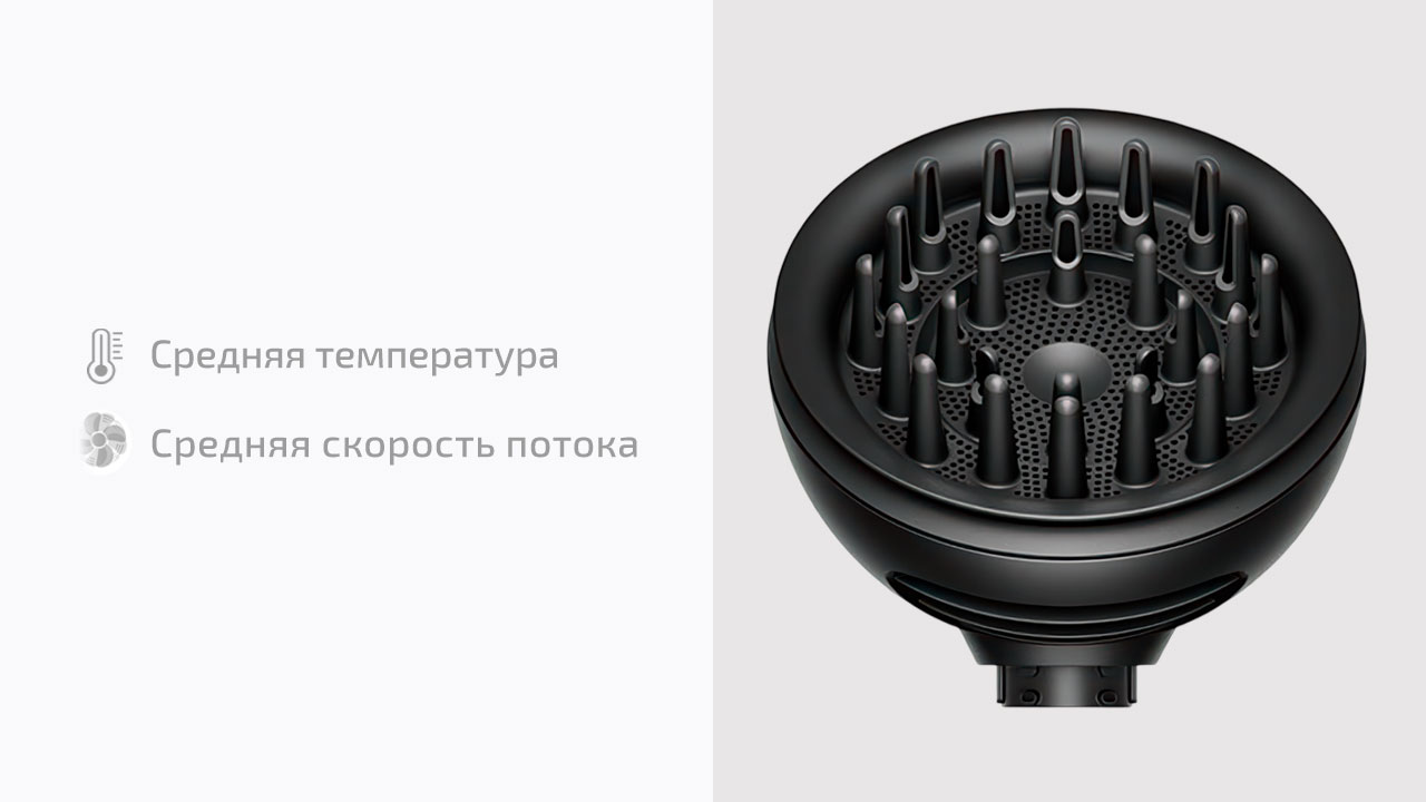 Диффузор 2-в-1 работает с естественной текстурой — волнами, кудрями и плотными завитками. Он не меняет форму, а делает её более выраженной. Режим Dome формирует локоны и снижает пушение за счёт мягкого обволакивающего потока. Режим Diffuse добавляет объём и подчёркивает текстуру. Сушка остаётся равномерной, без перегрева и разрушения структуры завитка. Входит только в Curly+Coily.