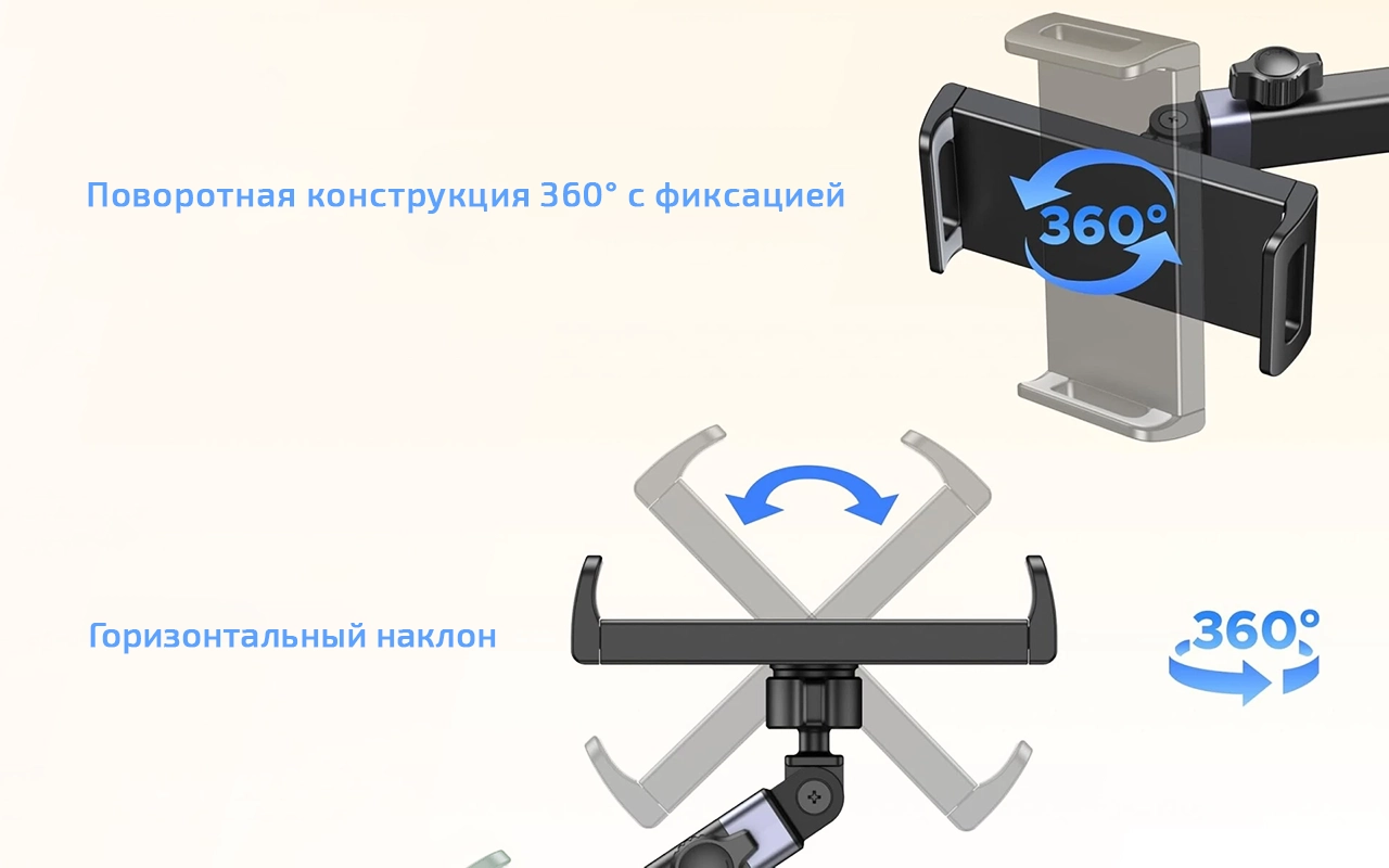 Благодаря конструкции с подвижной штангой и возможностью поворота на 360° вы можете легко настроить угол наклона так, как удобно – горизонтально для просмотра видео или вертикально для тиктоков и книг. А ещё можно поворачивать устройство и наклонять по горизонтали – например, чтобы экран не бликовал. Регулировка ширины зажима (от 120 до 250 мм) позволяет использовать как компактные смартфоны, так и крупные планшеты, а также ридеры с любой диагональю экрана.