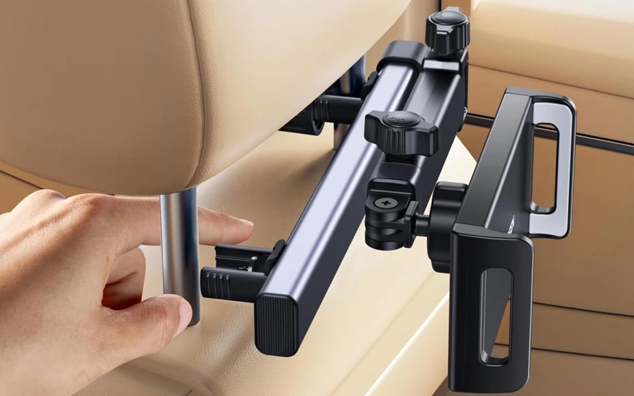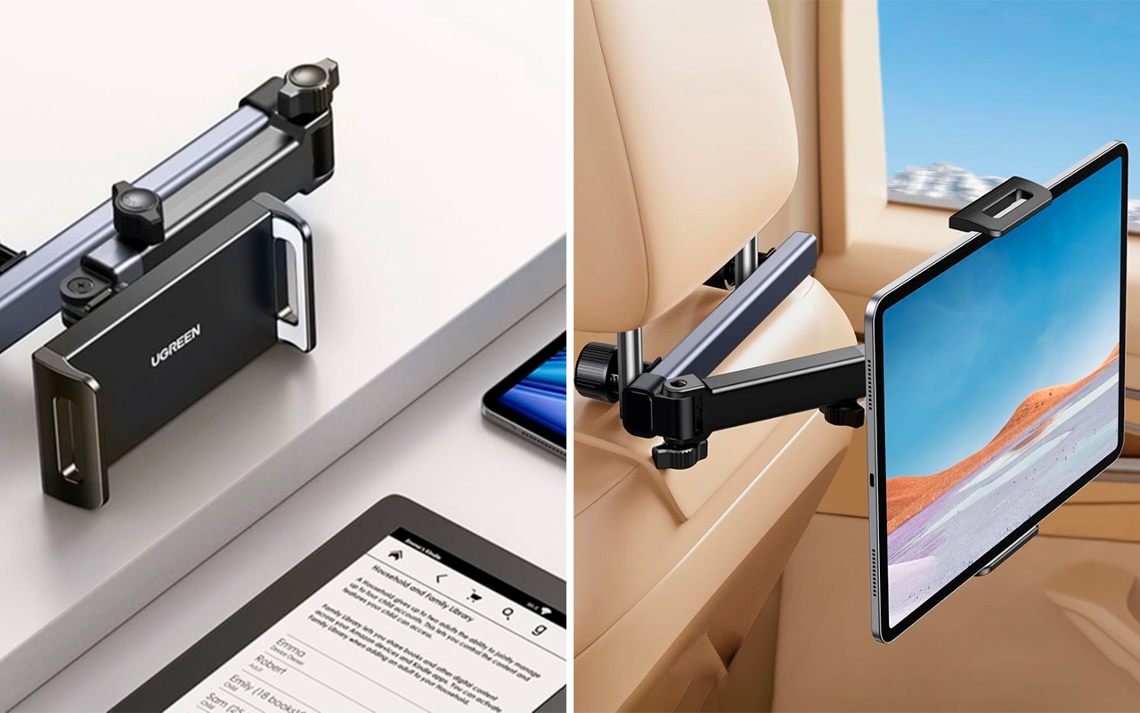 Наверняка, много планшетов «умерло» именно на заднем сиденье автомобиля, ведь там его легко оставить, а потом случайно сесть, сломав экран. Но это актуально, если у планшета или электронной книги там нет своего «дома», и с этим поможет данный держатель от Ugreen. Он крепится прямо на подголовник и не просто держит планшет, а позволяет поворачивать и наклонять его как угодно – можно даже выдвинуть на себя или расположить так, чтобы оба ребёнка смотрели мультики с комфортом.