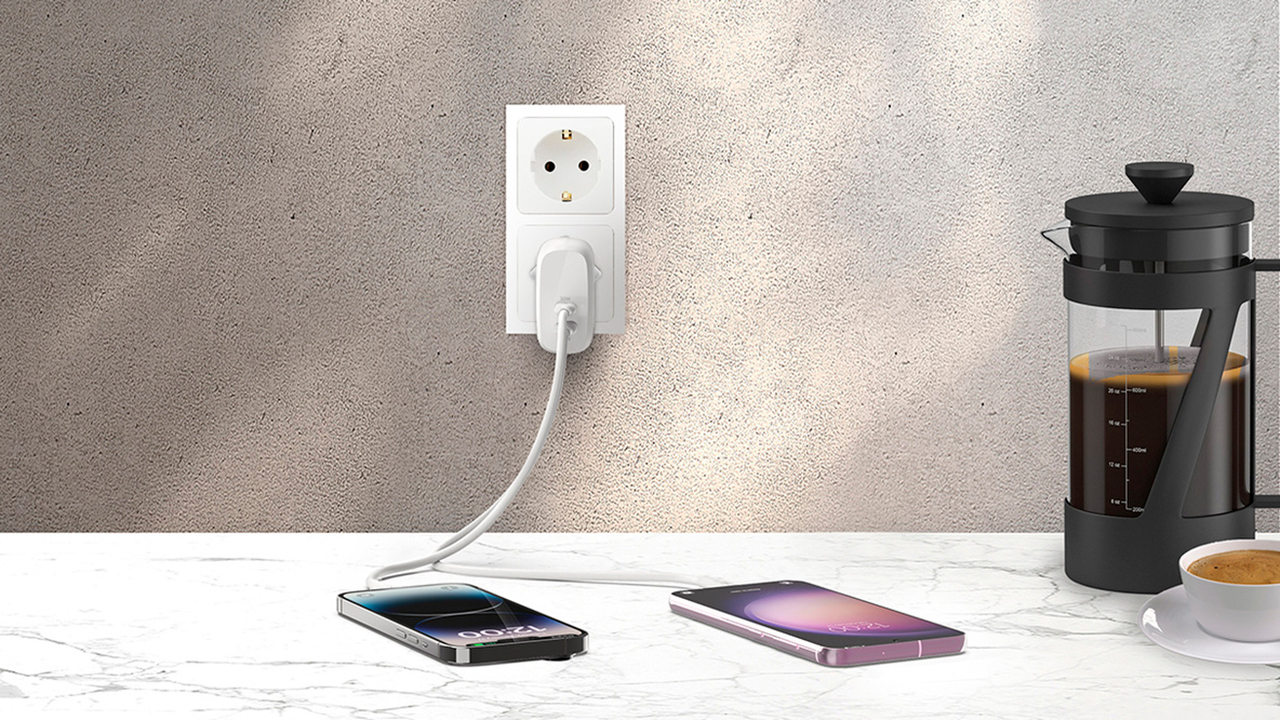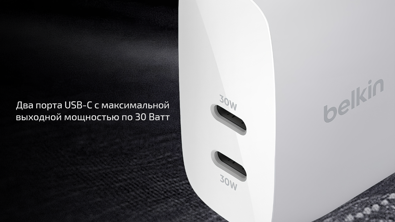 Belkin BoostCharge Pro – это компактный настенный адаптер, способный заменить сразу несколько зарядных устройств. Его два порта USB-C с поддержкой Power Delivery и технологии PPS обеспечивают быструю и безопасную подзарядку современного устройства, будь то смартфон, планшет или ноутбук. Максимальная мощность достигает 60 Вт, что позволяет даже требовательные гаджеты заряжать не «по капле», а действительно оперативно. В зависимости от сценария работы зарядка может отдавать все 60 Вт через один порт или делить мощность между двумя подключенными устройствами.