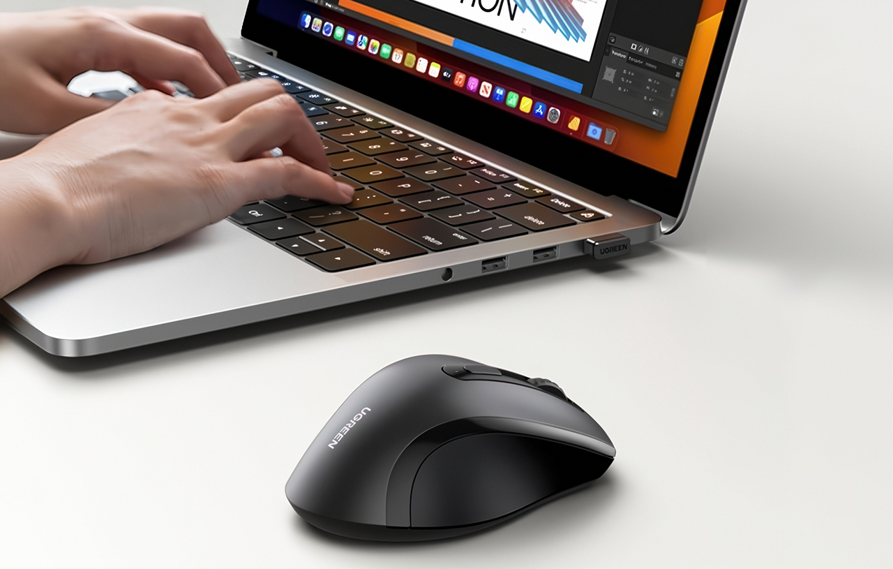 С выполнением набора обязательных элементов у UGREEN M511 сложностей нет никаких. Мышь уверенно соединяется с компьютером, приставкой или SmartTV с помощью комплектного USB-приёмника. Высокоточный сенсор с разрешением до 1600 DPI обеспечивает плавное и точное перемещение курсора, эргономичная форма с прорезиненными вставками – уверенный хват. Но даже если что-то пойдет не так, малая масса мыши (всего 85 г с батарейками) в совокупности с прочным пластиковым корпусом позволят пережить легкие удары и падения на пол.