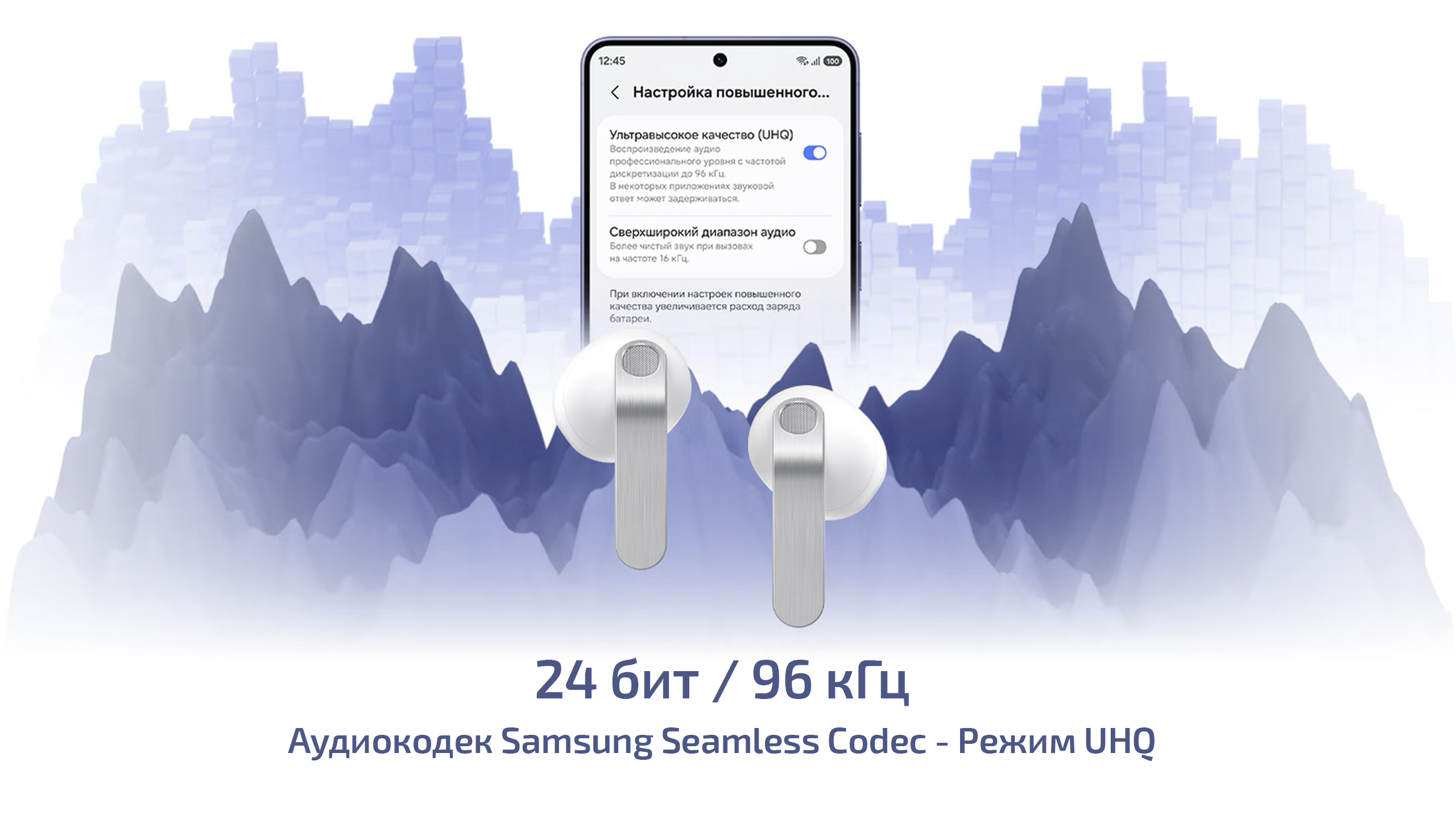 Galaxy Buds4 поддерживают Samsung Seamless Codec (SSC) и режим UHQ, который можно активировать на совместимом смартфоне Galaxy. В таком режиме передача идёт с параметрами до 24 бит / 96 кГц, значительно превосходя многие штатные кодеки Android, что помогает сохранить больше деталей записи и передать нюансы звучания аккуратнее. А ещё вы можете наслаждаться Lossless-форматами без прерываний и задержек.