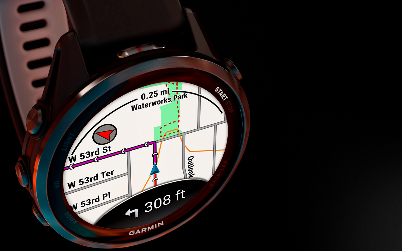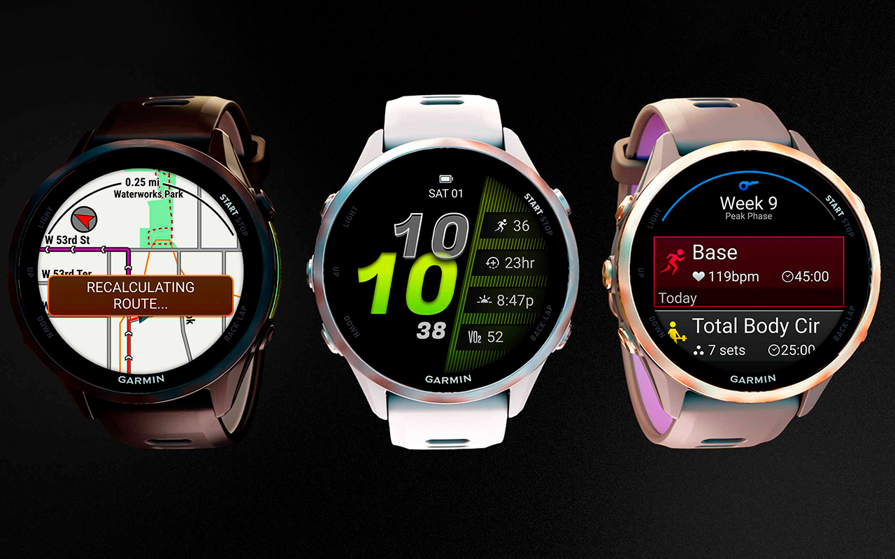 Яркий 1.4-дюймовый AMOLED-дисплей часов защищён прочным сапфировым стеклом, устойчивым к царапинам. Отображаемая на экране информация отлично читается даже при ярком солнце. Крепкий корпус устройства с титановым безелем тоже прекрасно сопротивляется появлению разного рода повреждений. При этом в корпус часов встроен LED-фонарик, который помогает осветить дорогу в темноте. Ну и конечно стоит отметить, что Garmin Forerunner 970 не обделены стандартными функциями умных часов. Они отображают текст входящих сообщений и позволяют ответить на звонок (устройство имеет встроенные динамик и микрофон), отображают погоду, позволяют управлять музыкой и так далее. Причём можно заливать любимые песни прямо на встроенную память часов (32 ГБ), чтобы не брать на тренировку смартфон.