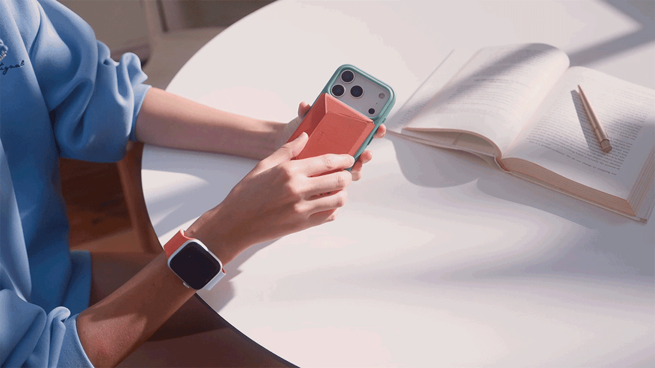Snap Field Wallet готов стать ещё и удобной подставкой для смартфона в тех ситуациях, когда экран нужен «на виду», а руки должны быть свободны. Достаточно всего одного лёгкого движения – и можно поставить телефон на поверхность под удобным углом. А это особенно пригодится для комфортного общения по видеосвязи, просмотра рецептов во время приготовления или перерывов на парочку видео. При этом смартфон надёжно держится на месте, не скользит и не опрокидывается.