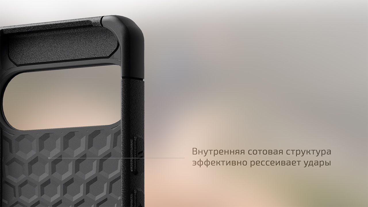 Усиленные углы и внутренние ячейки, в которых собирается воздух, прекрасно рассеивают силу удара по всей поверхности чехла. Защитный бортик по периметру лицевой панели препятствует контакту стекла с частицами пыли на различных поверхностях, снижая вероятность появления царапин. Аналогичным образом защищены и объективы тыльной камеры.