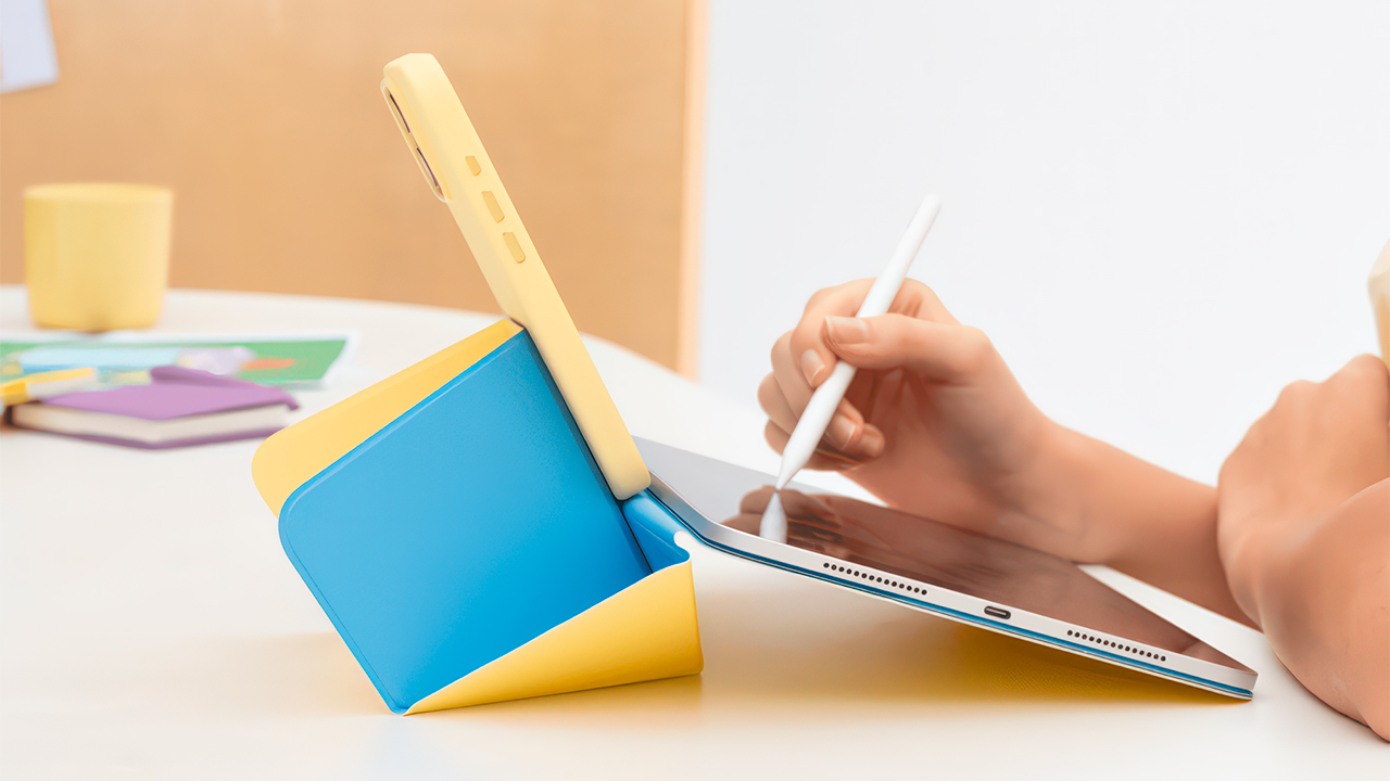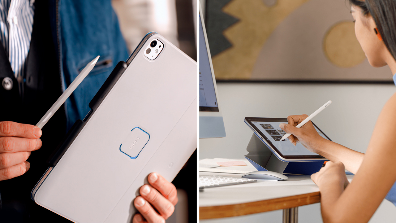 MOFT Dynamic Folio – не просто очередная обложка для iPad, а довольно оригинальный аксессуар, ведь он может выступать в качестве подставки одновременно для двух устройств: планшета и смартфона. Представьте: вы можете рисовать или редактировать видео на планшете, а прямо над ним, расположить свой iPhone для видеозвонков или просмотра вертикального контента в социальных сетях. А ещё обложка позволят расположить iPad под комфортным углом в вертикальном режиме.