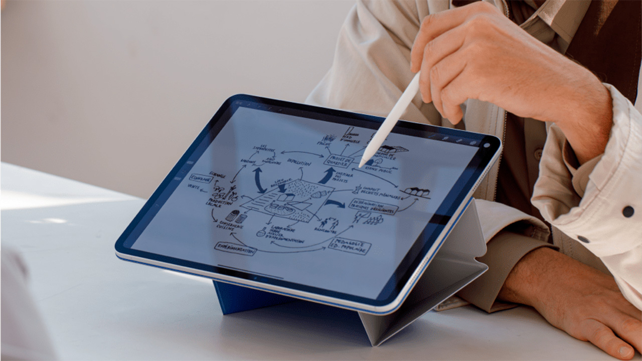 В зависимости от выбранного положения, доступно более 20 вариантов угла наклона, а ещё конструкция сгибов откидной части позволяет с комфортом рисовать, поставив планшет себе на колени, она буквально создано такой ради этой возможности! Ну а чтобы не потерять свой стилус, можно приобрести специальный отдельный держатель, который дополнительно фиксирует Apple Pencil.
