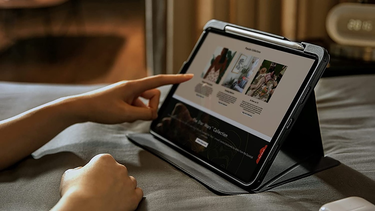 Чехол tomtoc Inspire-B50 Tri-Mode Case также готов быстро трансформироваться в подставку, причём не с одним, а тремя разными положениями. Для рисования или письма – слегка приподнятый над поверхностью, чтобы обеспечить естественное положение руки. Для видеозвонков или чтения – вертикальная ориентация с устойчивой опорой. А для просмотра контента особенно комфортно горизонтальное положение, где угол ещё можно дополнительно отрегулировать.