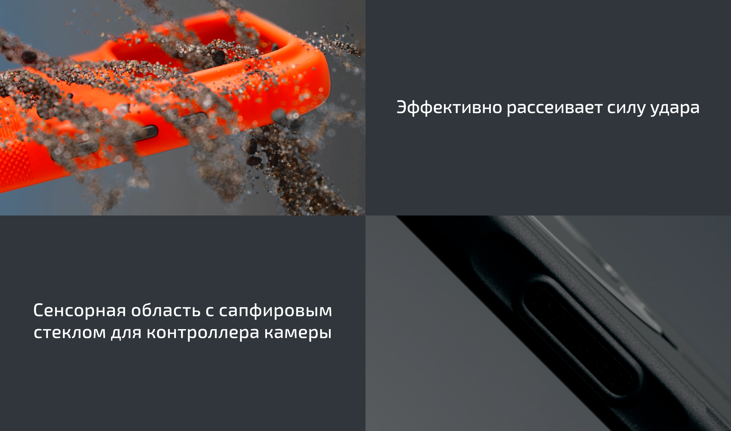 Ударопрочная задняя стенка из особого полимера эффективно рассеивает силу удара. Способствует этому и периметр чехла. А рельефные элементы позволяют с комфортом держать смартфон в перчатках или мокрыми руками, снижая риск выронить гаджет. Вырез камеры здесь примечателен выступающим защитным бортиком.