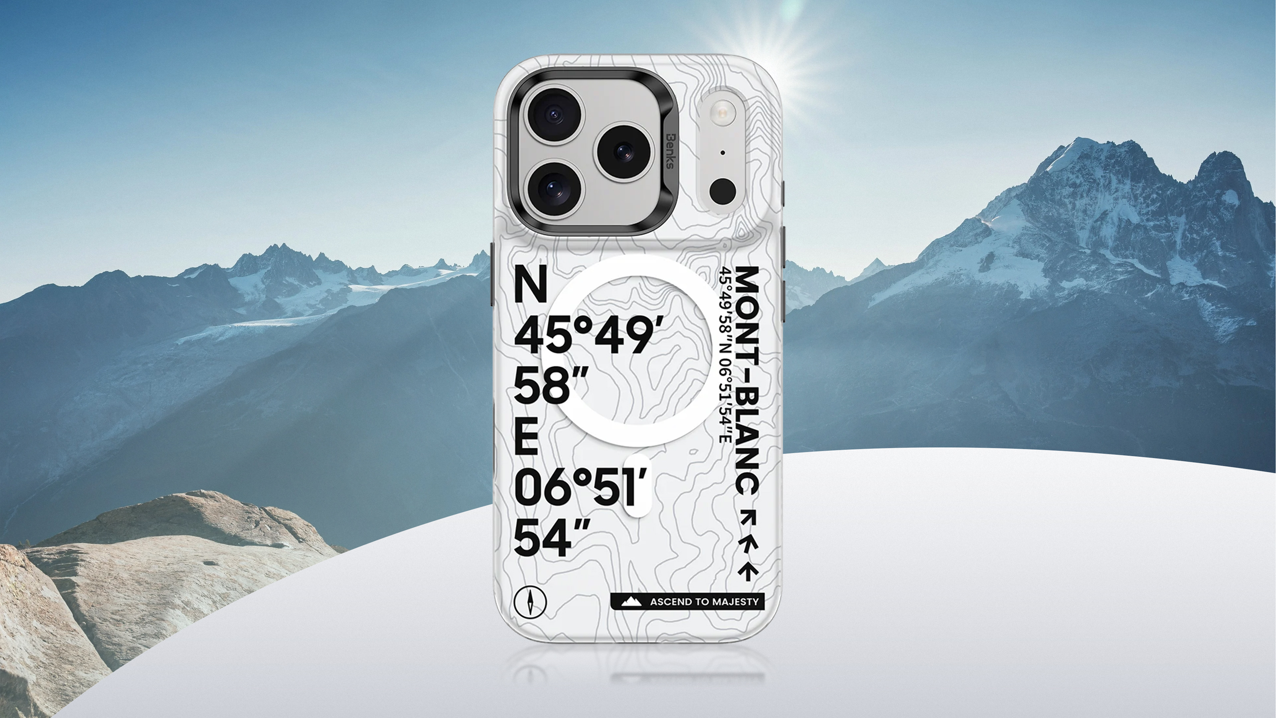 Эта серия чехлов одним своим видом вызывает желание бросить всё и прямо сейчас отправиться покорять Альпы. Его лаконичный дизайн вдохновлён вершиной Монблан – символом альпинизма и высочайшей точкой Альп, расположенной на границе Франции и Италии. Чехол украшают и координаты одноимённого горнолыжного курорта, а белая расцветка отсылает к заснеженным трассам (и к знаменитому одноимённому десерту Monte Bianco тоже). Дух приключений, альпийский вайб и продуманная во всех отношениях защита смартфона – всё это Summit Mt. Blanc от Benks!