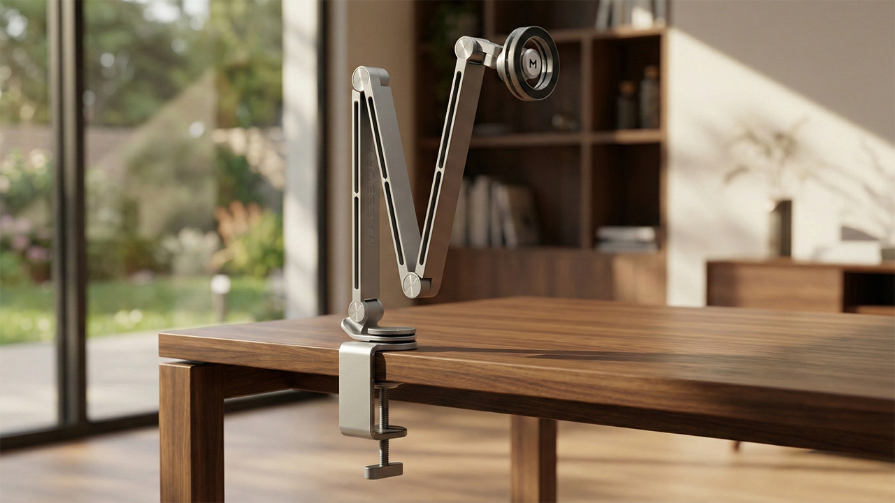 В основе конструкции Magssory Arm прочный алюминиевый сплав. Он не только отлично выглядит, но и не боится активного использования. Крепление к поверхности осуществляется с помощью регулируемого винта, который надёжно фиксирует держатель на столе или другой опоре. Также в комплект входит насадка-держатель для микрофона, расширяющая функциональность конструкции при записи видео или проведении трансляций.