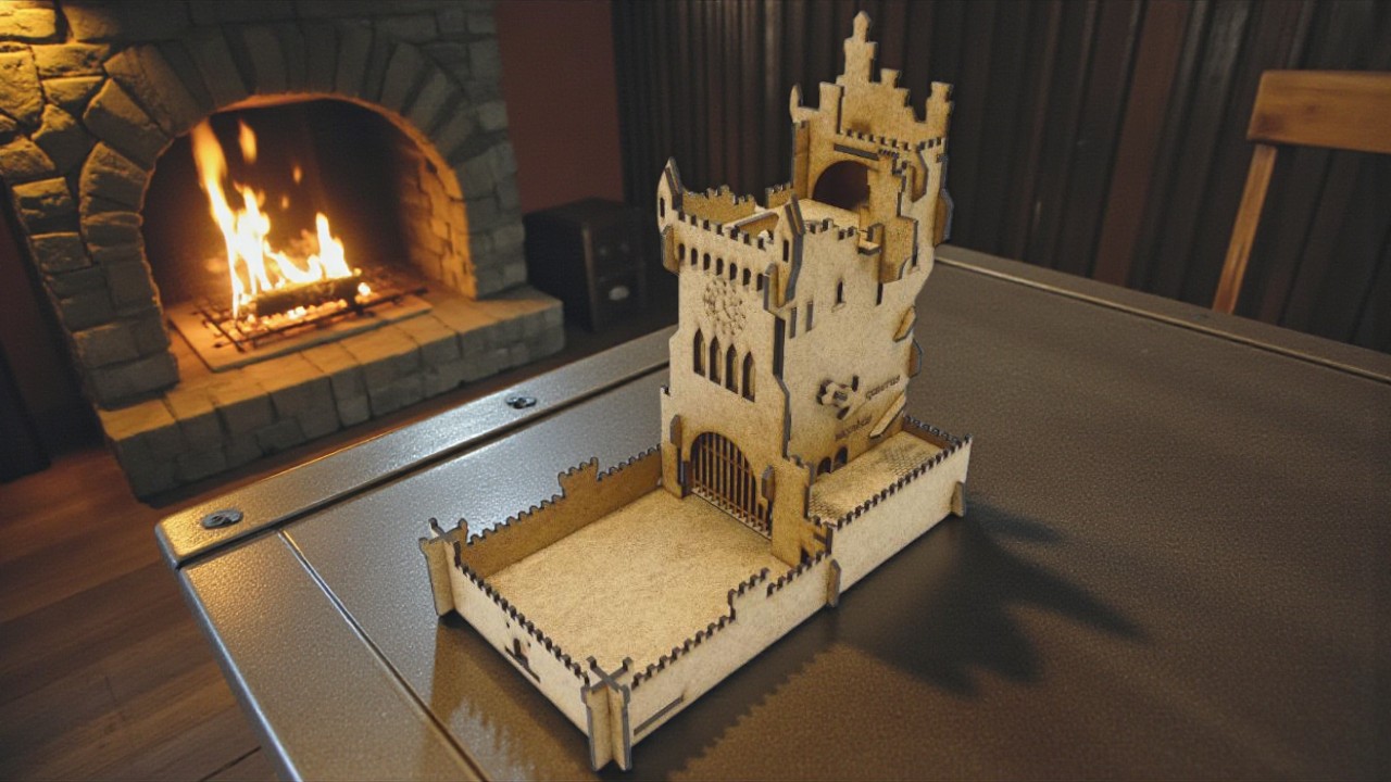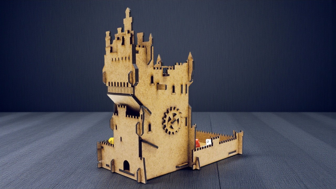 Как и подобает старинному замку, этот дайс-тауэр полон тайн и загадок. Помещенные на крышу кубики проваливаются внутрь, стоит лишь немного нажать на секретный рычаг, замаскированный под одну из крепостных башенок. Механизм не только запускает ход, но и полностью оживляет донжон: решётка поднимается, в окнах появляются любопытные зрители, а кубики, проходящие через лабиринт внутри стен, выкатываются во внутренний огороженный стенами дворик. При этом игрок не может повлиять на результат, но волен выбирать скорость броска, для чего на боку есть специальное зубчатое колесо, меняющее конфигурацию перегородок. А ещё гордый владелец может раскрасить свой замок акриловыми красками так, как ему заблагорассудится, и второго такого же не будет в целом мире.