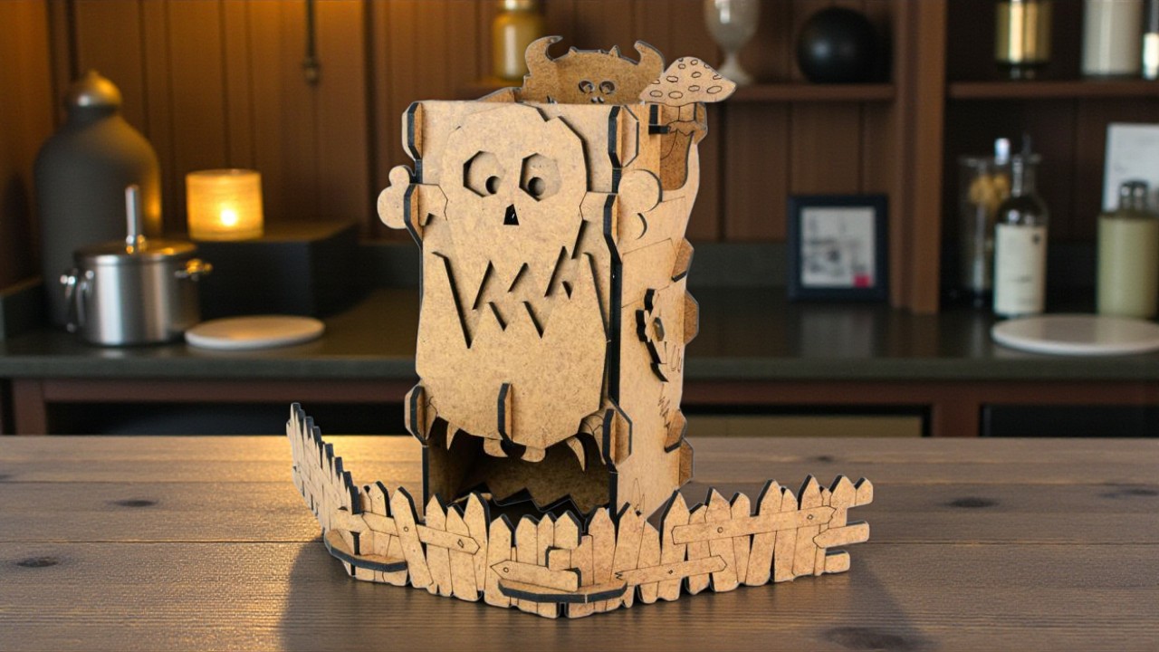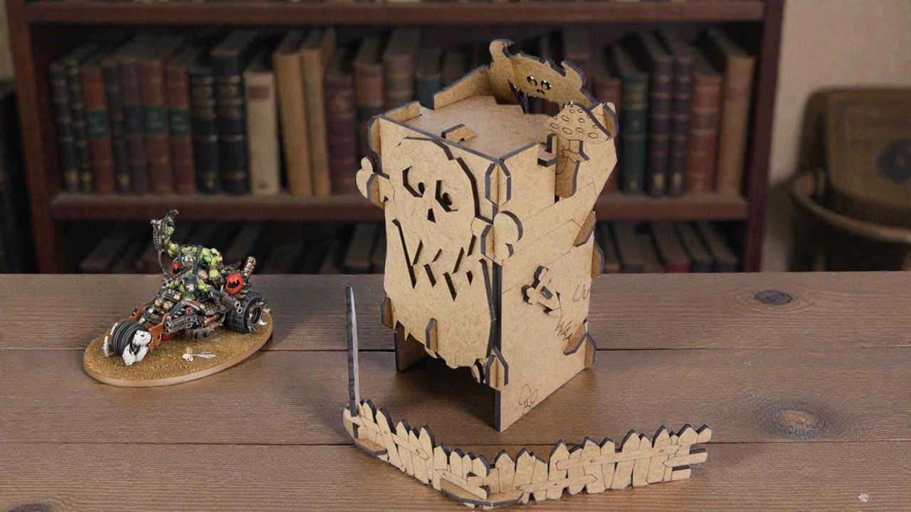 Башня для кубиков «Тотем орков» напоминает жилище зеленокожего военначальника, сколоченное батраками с двумя очевидными целями – наполнять страхом сердца противников и воодушевлять союзников по клану, и с одной не очевидной – притягивать удачу (но последнее – дело его величества случая). Гротескный череп на фасаде, приводимый в движение рычажным механизмом и сталкивающимися внутри кубиками строит жуткую гримасу, шевелит глазами в поисках добычи и ухмыляется в предвкушении удачного броска. То, что нужно, чтобы создать сумятицу, если границы поля боя подобрались достаточно близко.