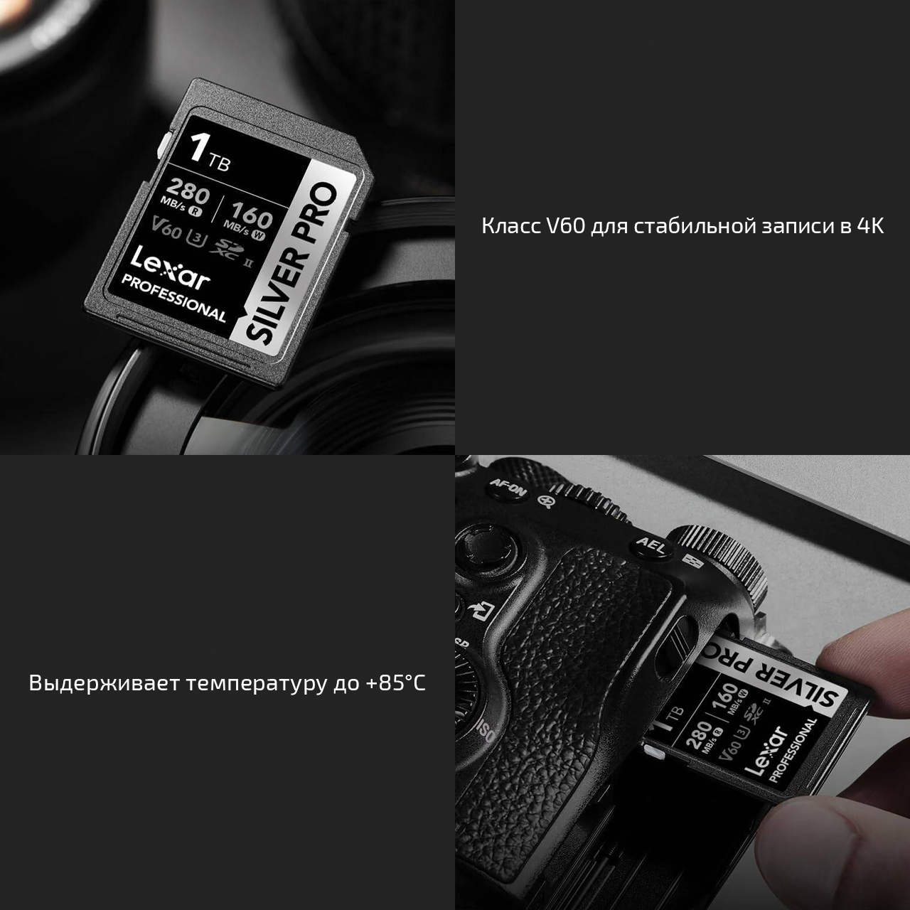 Современной камере – современную карту! И отличным вариантом будет серия Professional Silver Pro от Lexar. Эти карты соответствуют классу V60, что означает возможность писать видео со стаибльной скоростью не менее 60 МБ/с и делает такую карту отличным вариантом для 4K-видео с высоким битрейтом или даже 6K-видео, а максимальная скорость записи у карты на 256 ГБ составляет 160 МБ/с.