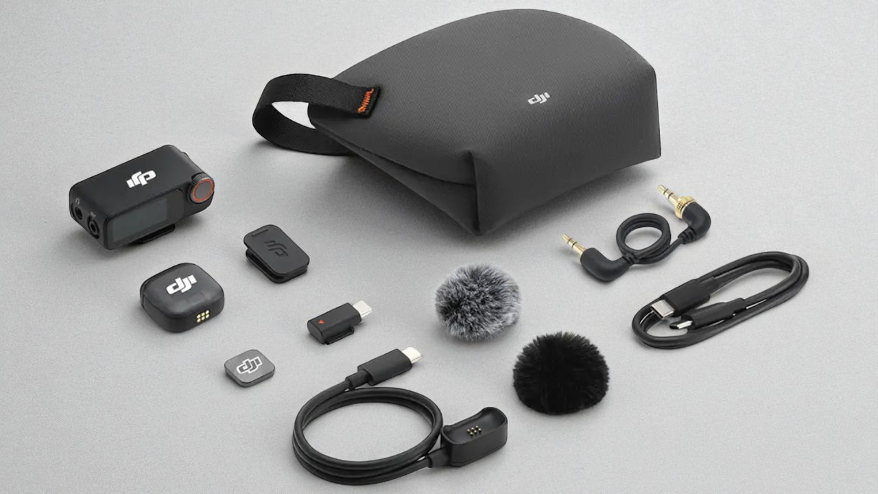В этот комплект DJI Mic 3 входят один передатчик и один приёмник, а также все необходимые аксессуары: адаптер Type-C для мобильных устройств, ветрозащита двух расцветок (чёрная и чёрно-серая), магнитный держатель с зажимом, фиксируемый 3,5-мм TRS кабель, отдельный магнит для крепления и кабели для зарядки (один USB-C и один магнитный для передатчика). Удобно переносить это позволяет компактный чехол.
