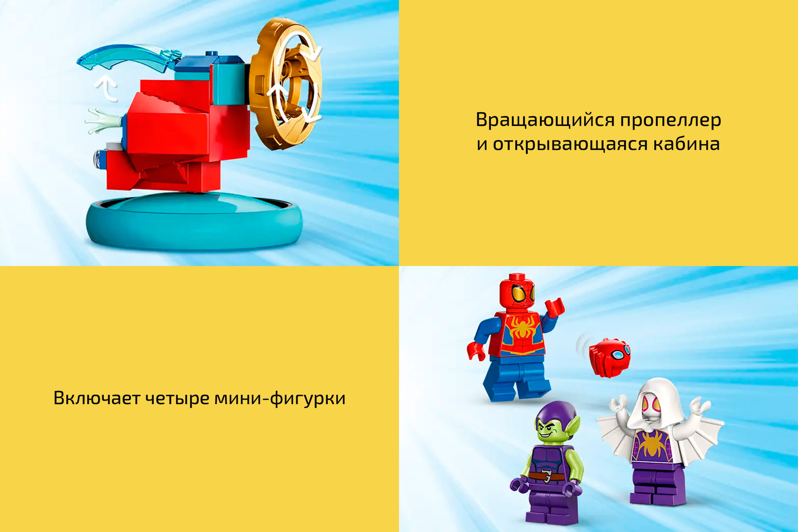 Глайдер Зелёного гоблина имеет размеры 14 х 8 х 3 см. Ховеркрафт Человека-паука отличается открывающейся кабиной с символикой супергероя и вращающимся задним пропеллером. Помимо техники, в набор входит небольшой, но детализированный пирс со свежим уловом: рыбой и крабом. Такое хорошее начало дня для рыболовов, а тут эти супергерои и злодеи прилетели и всё испортили!