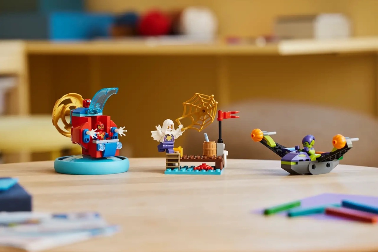Спайдермен взял с собой подругу, Гвен Стейси (точнее – Призрачного паука), а вдобавок – робота Trace-E. Втроём они точно накинут на злодея паутину. Которая, кстати, тоже входит в набор. Но ему тоже есть чем отбиваться, ведь летающий глайдер Зелёного гоблина оборудован ракетами-тыквами, но у паучка тоже есть орудия с паутиной в катере, целых два! Жаль только, что все пушки здесь не стреляют.