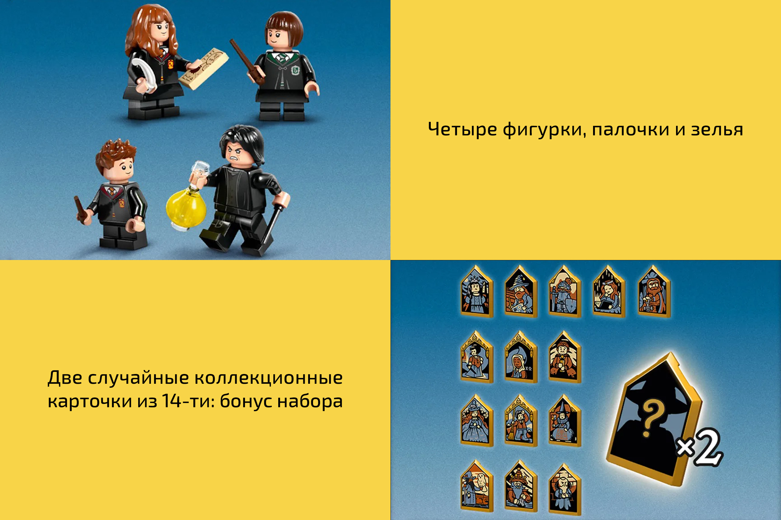 Набор включает мини-фигурки Гермионы Грейнджер, Пэнси Паркинсон, Симуса Финнигана и Северуса Снейпа (также известного как Северус Снегг и Злодеус Злей). Для всех персонажей положили волшебные палочки, воссозданные в соответствии с фильмами, которые можно вставить им в руки, но более каноничным вариантом будет вооружить профессора Снегга – только колбами, ведь все мы помним, что: «На этом уроке не будет дурацких взмахов волшебной палочкой и глупых заклинаний».
