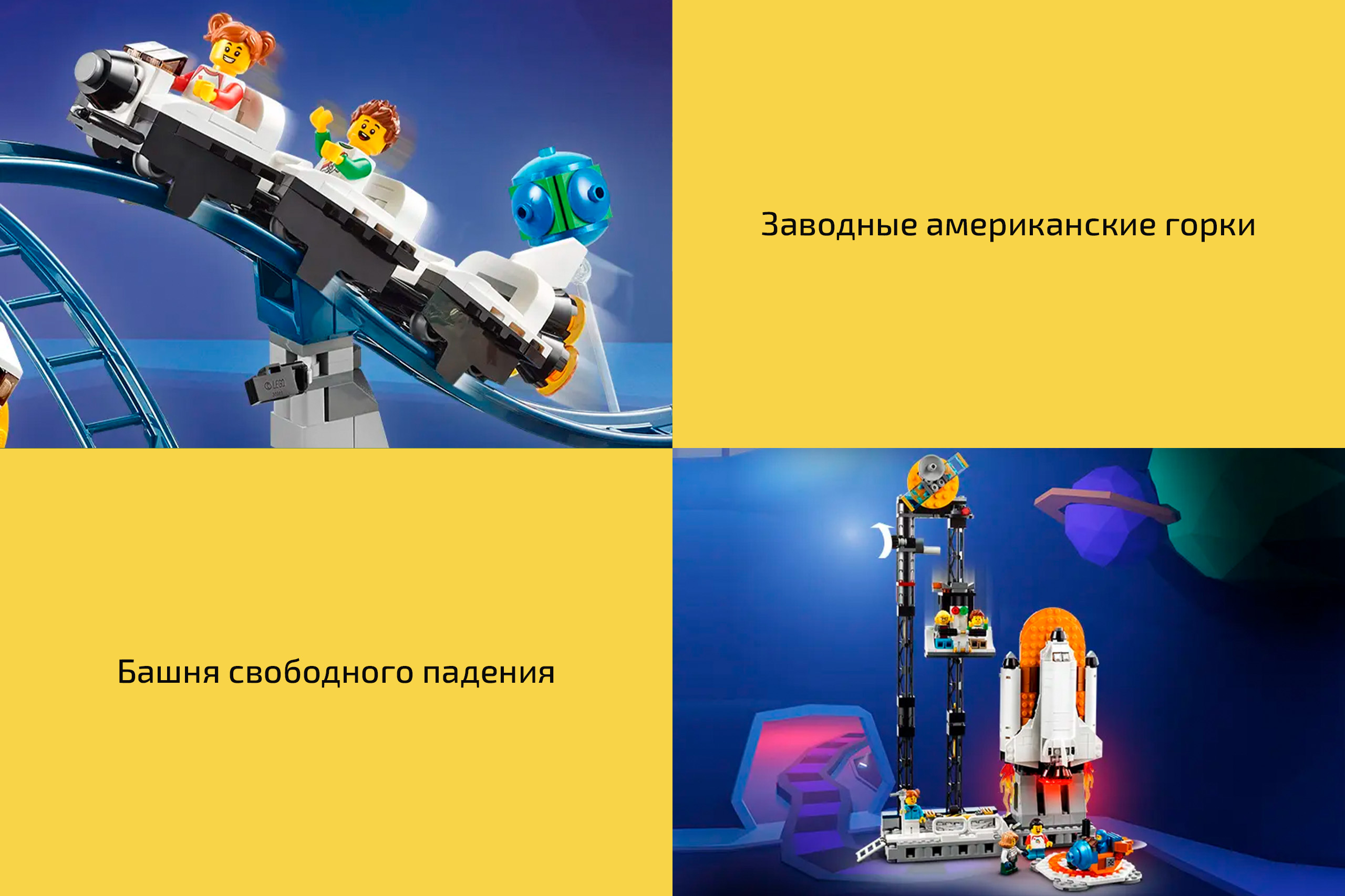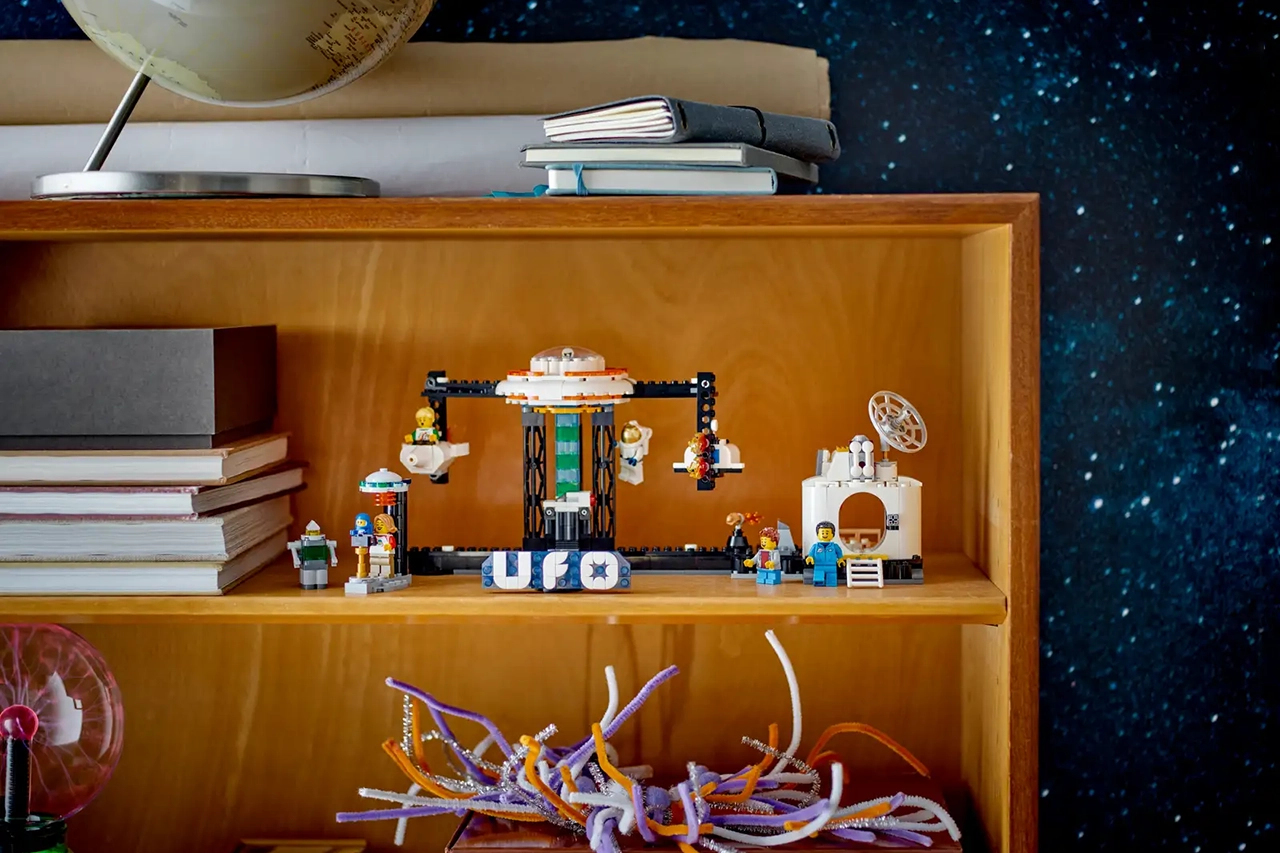 Конструктор включает пять мини-фигурок, не считая инопланетных форм жизни. Прокатите ЛЕГО-человечков на захватывающих дух американских горках, заставьте их резко спуститься с башни, пролетая мимо двигателей ракеты-носителя с челноком, а если хочется чего-то поспокойнее – классическая карусель никогда не потеряет актуальности, а ещё в разных версиях есть аттракционы поменьше, но тоже действующие!