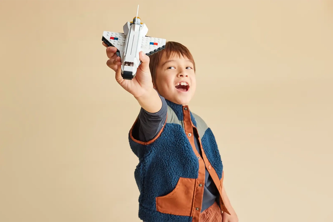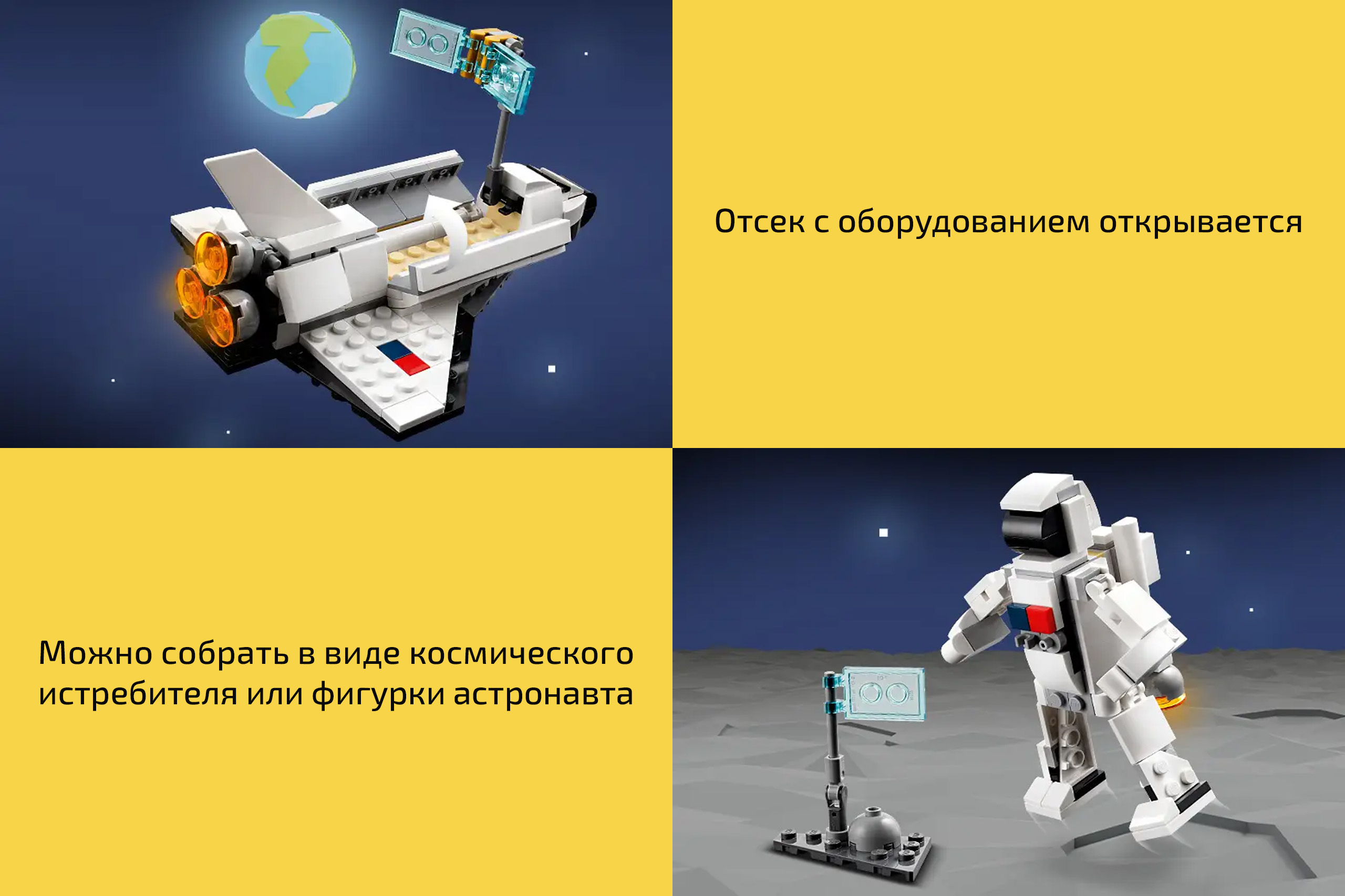 Помимо шаттла, можно собрать фигурку астронавта, устанавливающего флаг, а ещё фантастический звёздный боевой истребитель. Для каждого из вариантов предусмотрена подробная пошаговая схема, где ничего не нужно читать и переводить, а рассчитан этот набор, состоящий из 144 деталей, на детей в возрасте от 6 лет.