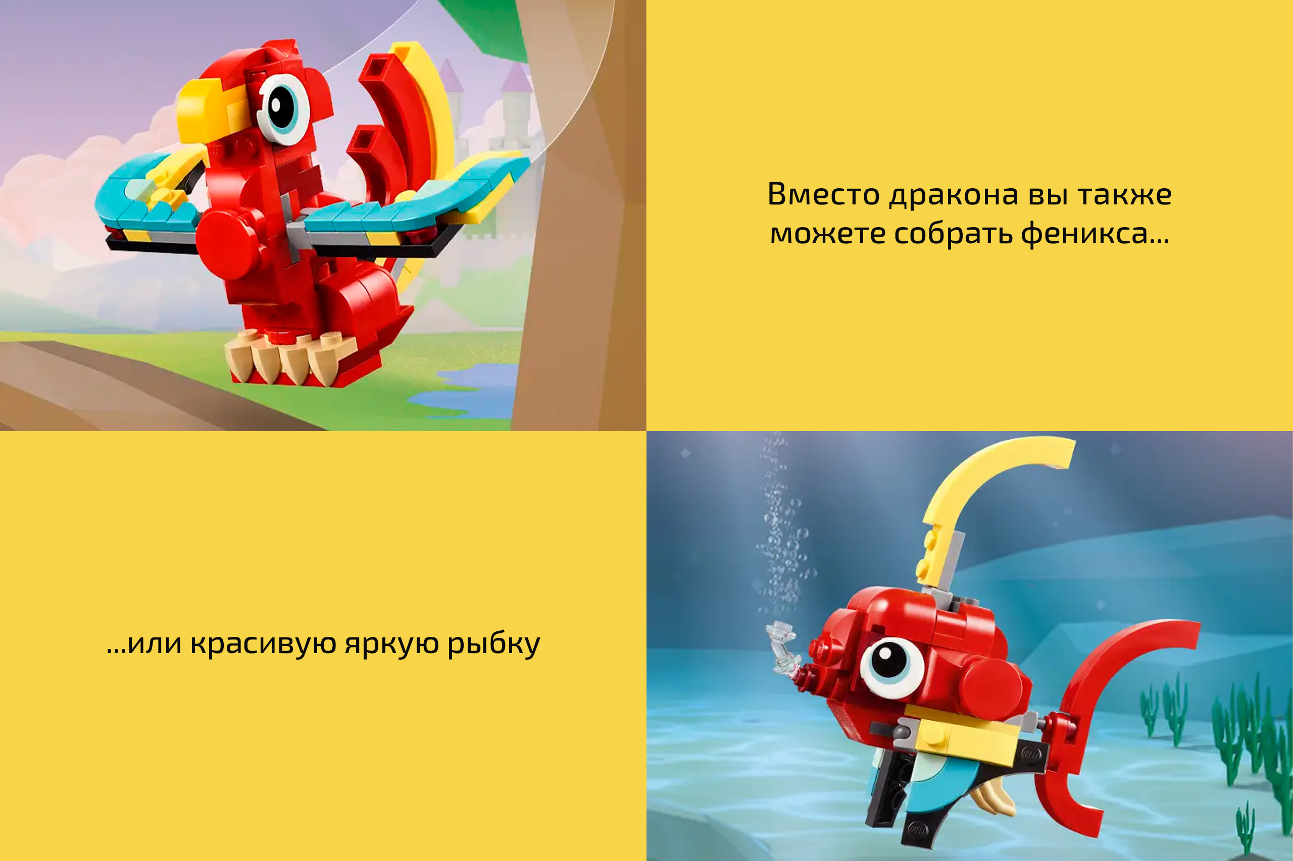 Реиграбельность и вариативность здесь на высоте! Надоел дракон? Соберите птицу феникс или яркую морскую рыбку. Вне зависимости от вариации, готовые существа будут отличаться подвижными элементами, а собрав несколько наборов данной серии, можно организовать целый сказочный зоопарк!