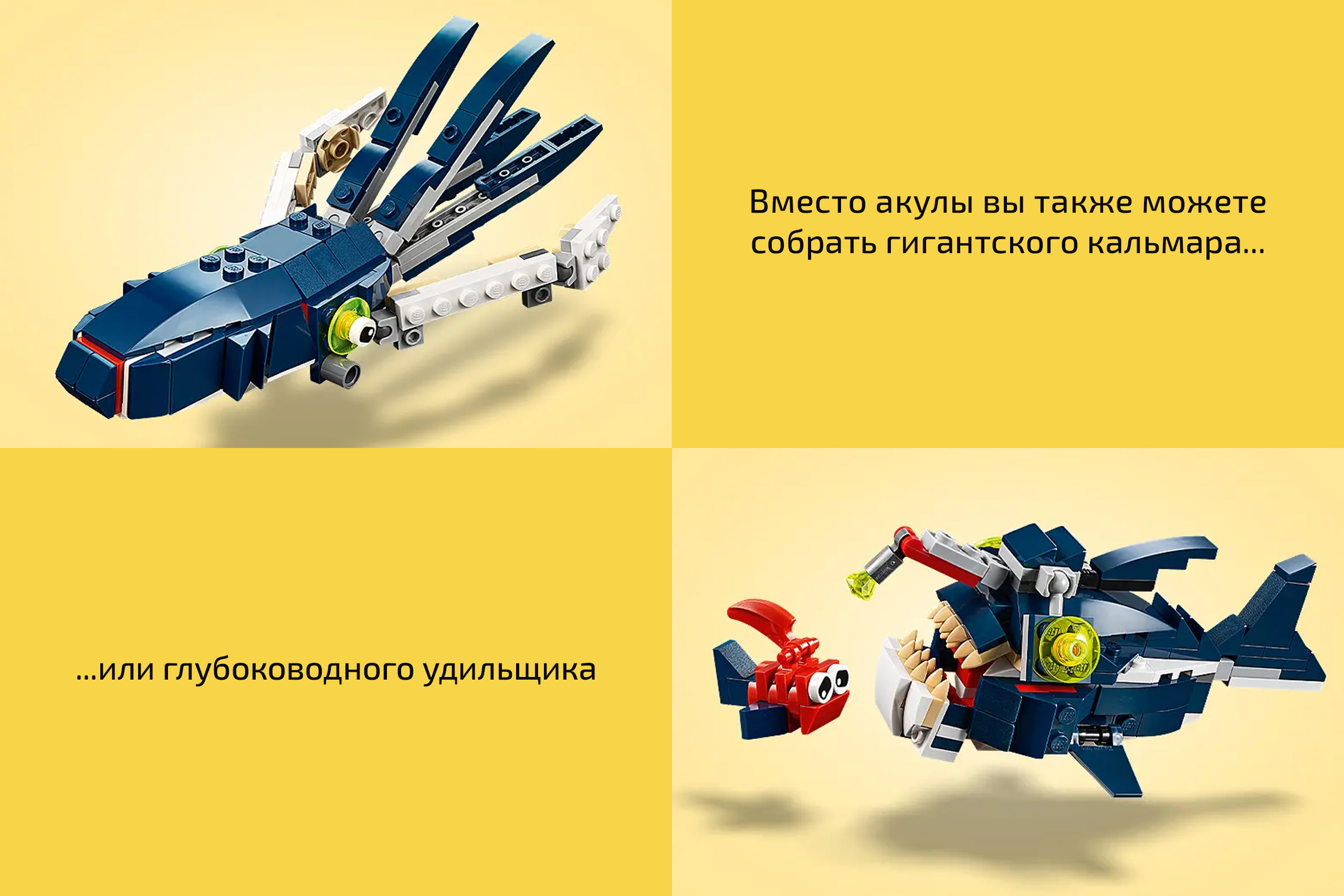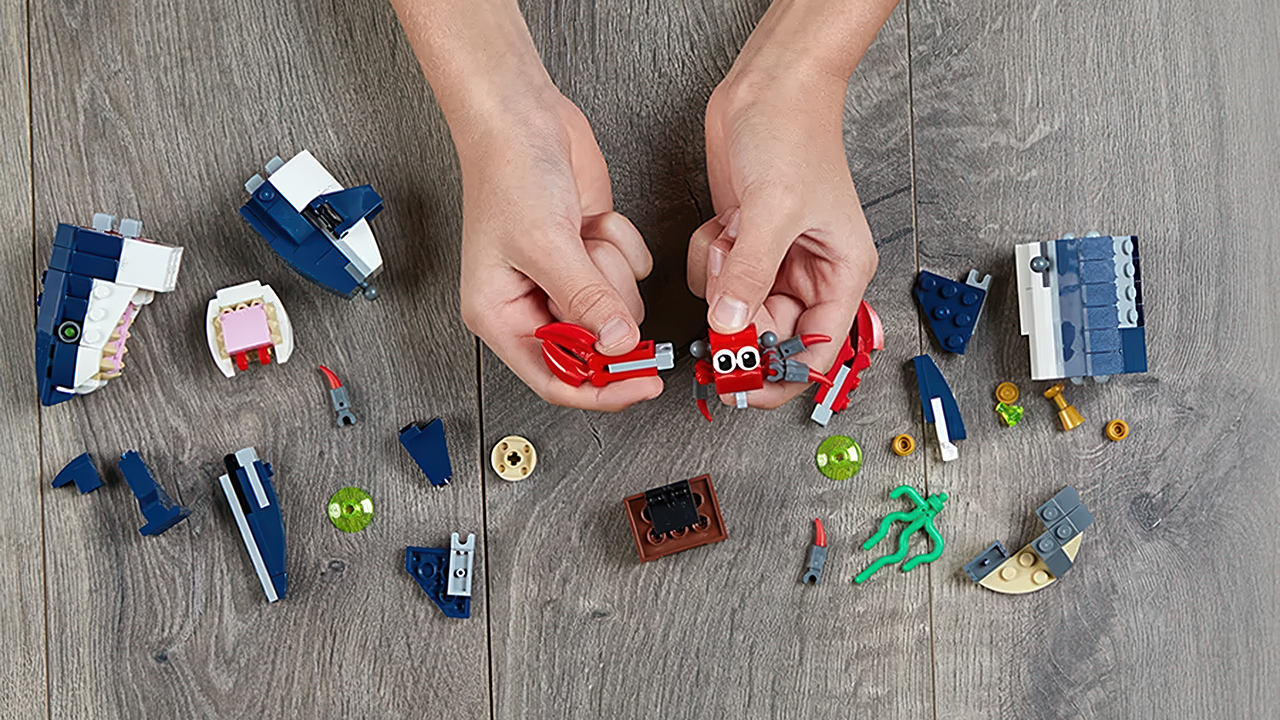 Наборы Creator 3 в 1 –идеальный выбор для тех, кто только открывает для себя мир конструкторов LEGO. С подробной пошаговой схемой, в которой ничего не требуется переводить и даже читать, дети в возрасте от 7 лет легко разберутся без помощи родителей, причём процесс сборки подробно изложен для каждого из трёх вариантов. Размеры акулы составляют 21 х 8 х 9 см, кальмара – 18 х 4 х 22 см (с максимальным размахом щупалец), а удильщика – 14 х 5 х 8 см.