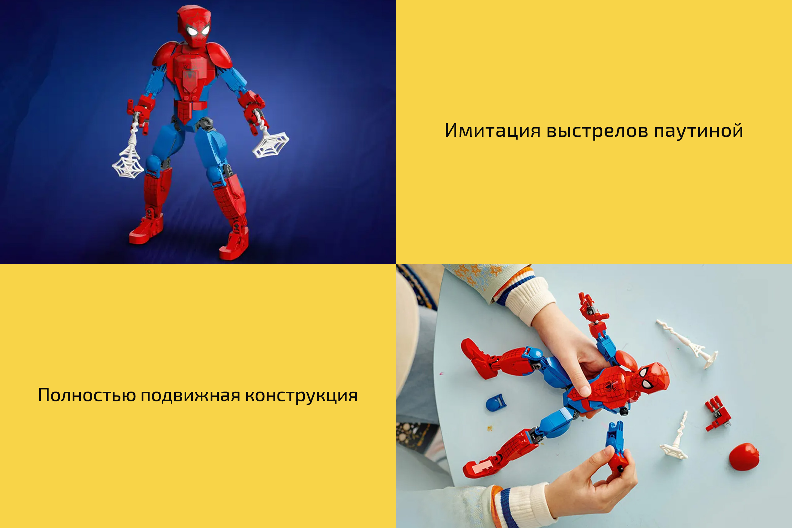 Высота готового Спайдермена составляет 24 сантиметра. Руки и ноги героя полностью подвижные, причём в нескольких точках, что позволяет не только фиксировать персонажа в реалистичных боевых стойках, но и устраивать баталии с друзьями.
