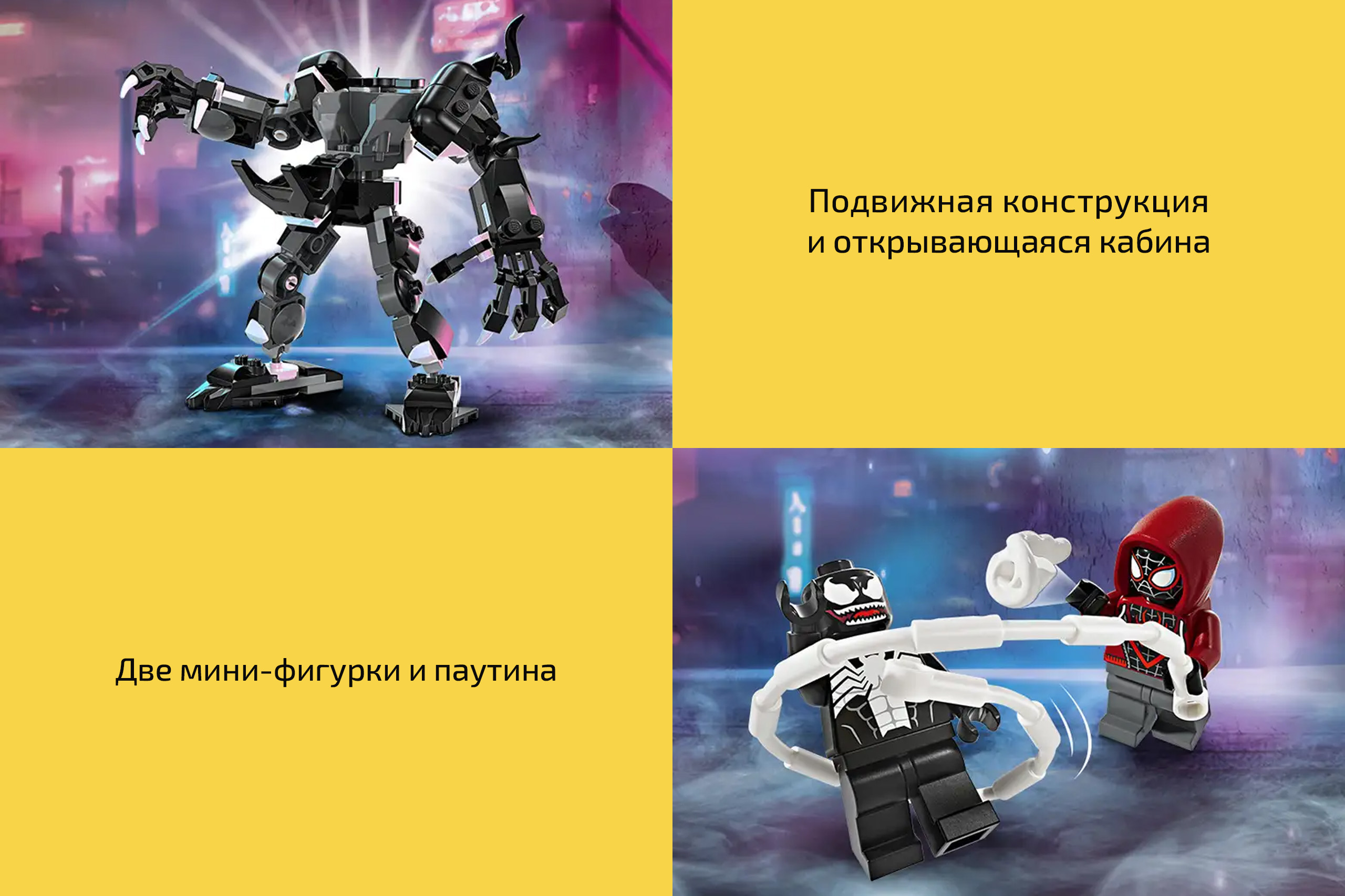 Робот полностью подвижен за счёт шарнирных элементов. Кабина открывается: туда можно посадить фигурку Венома и сдавить Человека-паука в мощной клешне. Даже пальцы устрашающих когтистых рук меха двигаются. А ещё такая конструкция позволяет ставить робота в любые боевые стойки.