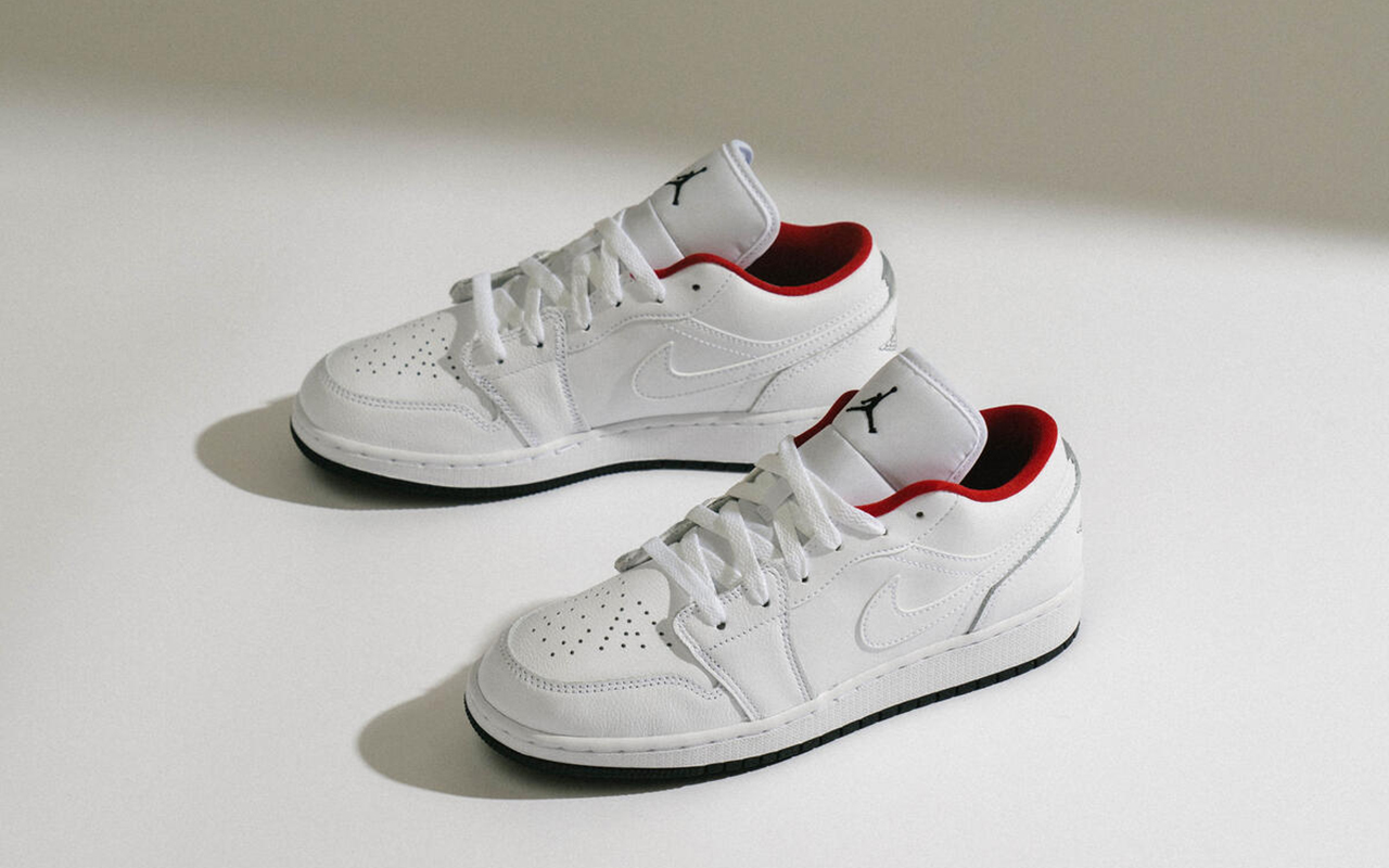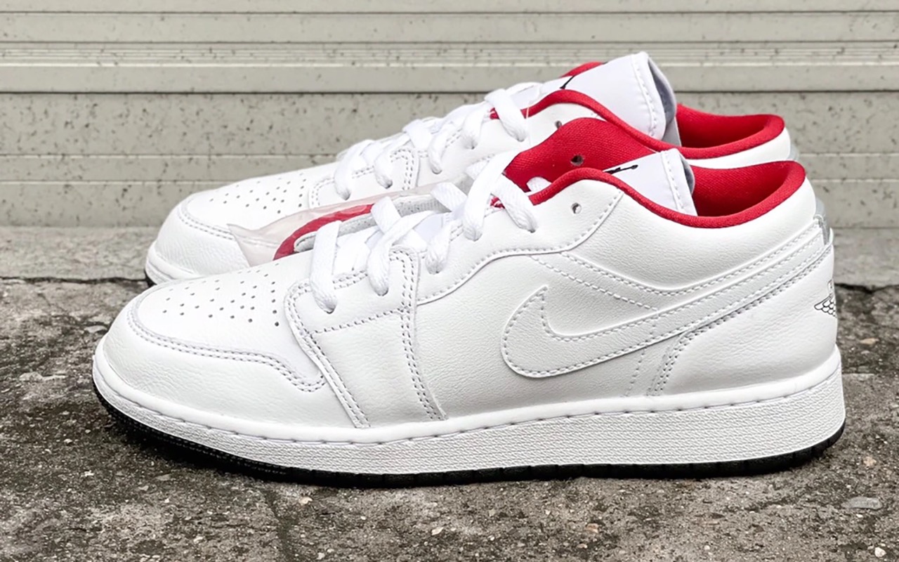 Низкие Air Jordan 1 с верхом из белой кожи, подчёркнутым контрастным красным валиком для щиколотки и ахиллесового сухожилия. Подошва модели примечательна знаковым для серии протектором. Кроссовки изготовлены по спецификациям, использовавшимся в год дебюта модели, что делает их достойным предметом коллекции даже для искушённых сникерхедов.