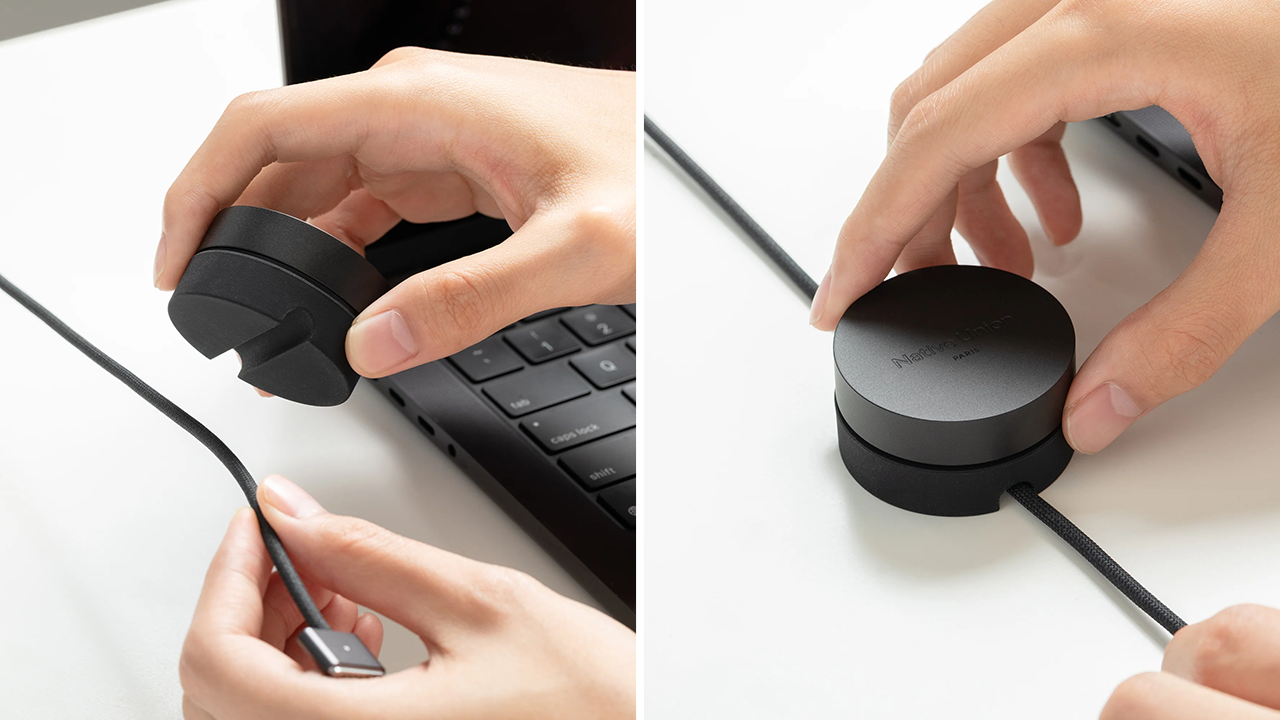 Native Union Weighter совсем небольшой – его габариты составляют 49,8 мм в диаметре и 26,3 мм в высоту. Так что его можно легко разместить даже на небольшом пространстве, например, между ноутбуком и краем стола. При этом внутри него скрыт металлический сердечник, который придаёт вес и устойчивость держателю. А снаружи здесь силиконовая основа, обеспечивающая надёжное сцепление с поверхностью. Благодаря этому стол не царапается, а сам держатель не сдвигается даже при резком вытягивании кабеля.