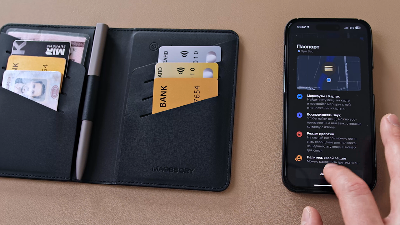 Но, без сомнений, самая интересная особенность Magssory Ultima Geo – это наличие встроенной метки Apple Find My. Она незаметно интегрирована в обложку и позволяет отслеживать её местоположение через приложение «Локатор» на любом устройстве Apple. Если вы случайно оставите паспорт в кафе, аэропорту или такси, достаточно открыть приложение – и можно отследить, где он находится. Это особенно ценно в путешествиях, где потеря документов может превратиться в настоящий стресс.