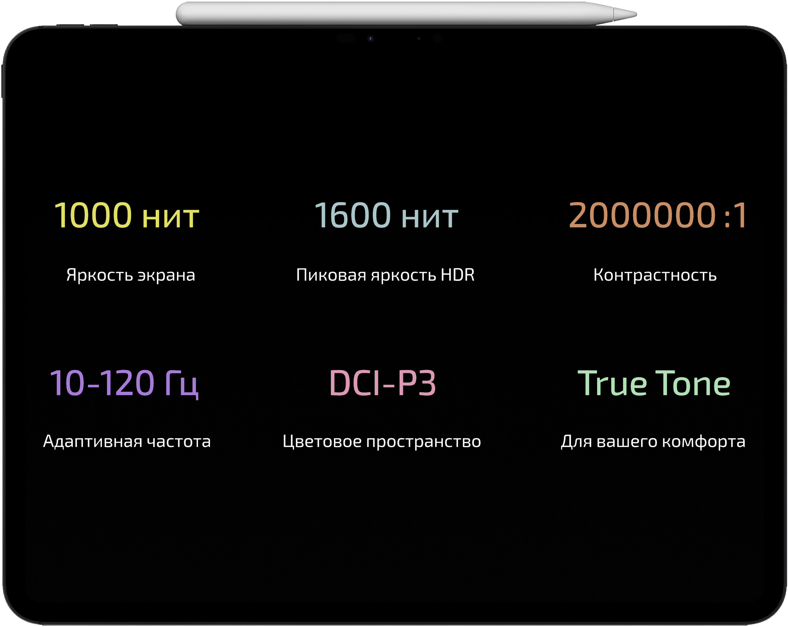 Дисплеи с частотой 120 Гц можно увидеть в большинстве смартфонов, но именно в iPad Pro эта особенность куда полезнее, особенно если вы рисуете с помощью стилуса. ProMotion с адаптивной частотой от 10 до 120 Гц обеспечит максимально приятный и естественный пользовательский опыт, а сочная контрастная картинка с идеальной цветопередачей исключает проблемы с цветами. Ну а если не хочется напрягать глаза, рисуя для вдохновения вечером – просто включите True Tone.