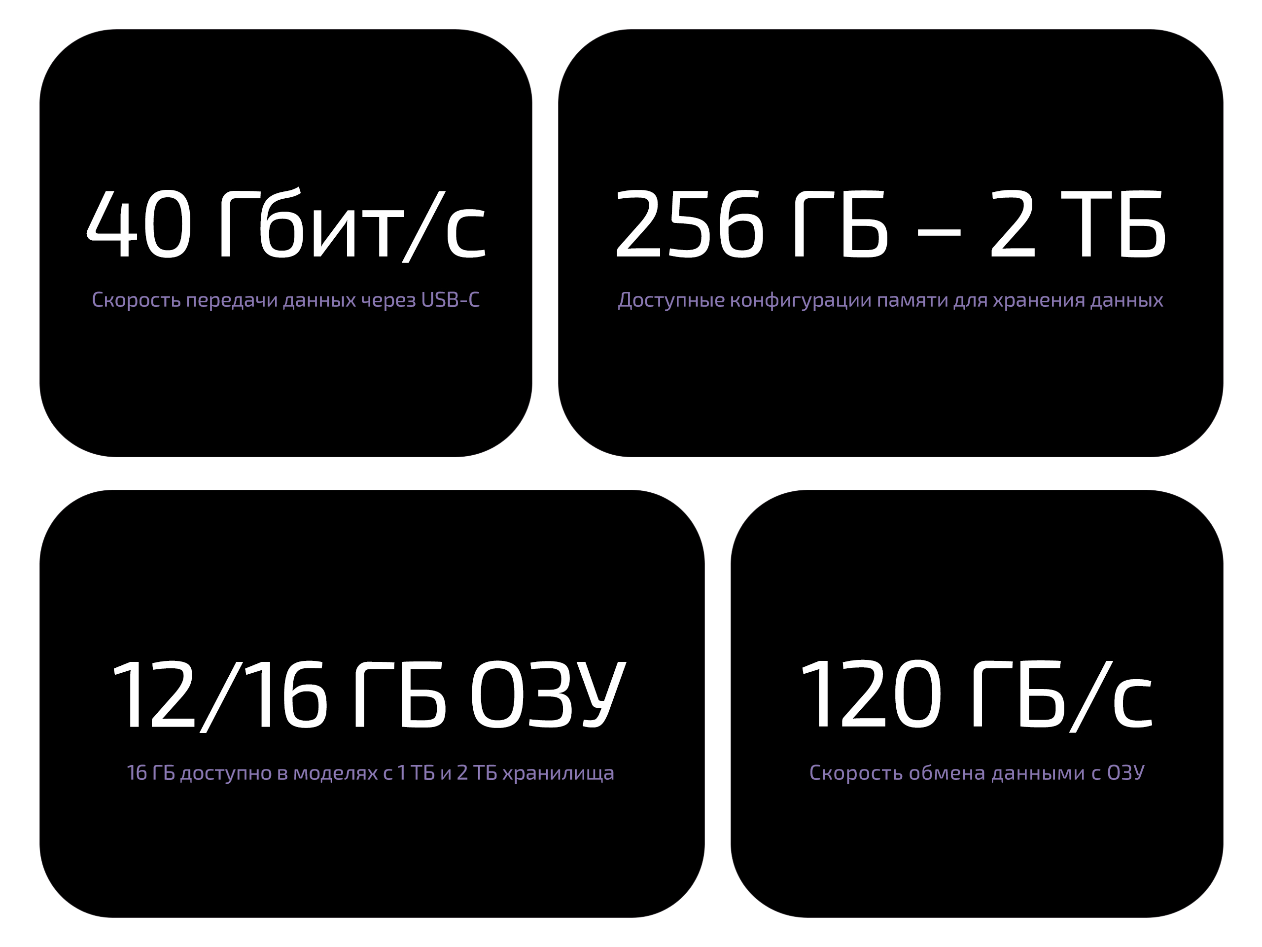 Высокоскоростной разъём USB-C с поддержкой Thunderbolt 3 и USB 4 позволяет подключать высокоскоростные носители данных, а также многопортовые хабы, превращающие один разъём в несколько нужных вам. Используйте проводные аксессуары, в том числе мыши и клавиатуры, выводите изображение на ТВ с разрешением 4K (до 120 Гц) или мониторы с разрешением до 6K (до 60 Гц), а ещё вы можете транслировать экран или выводить видео на дисплеи с AirPlay без проводов.