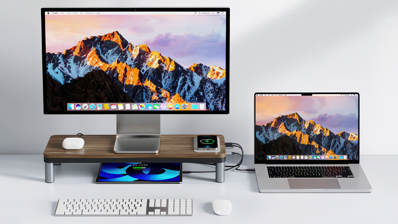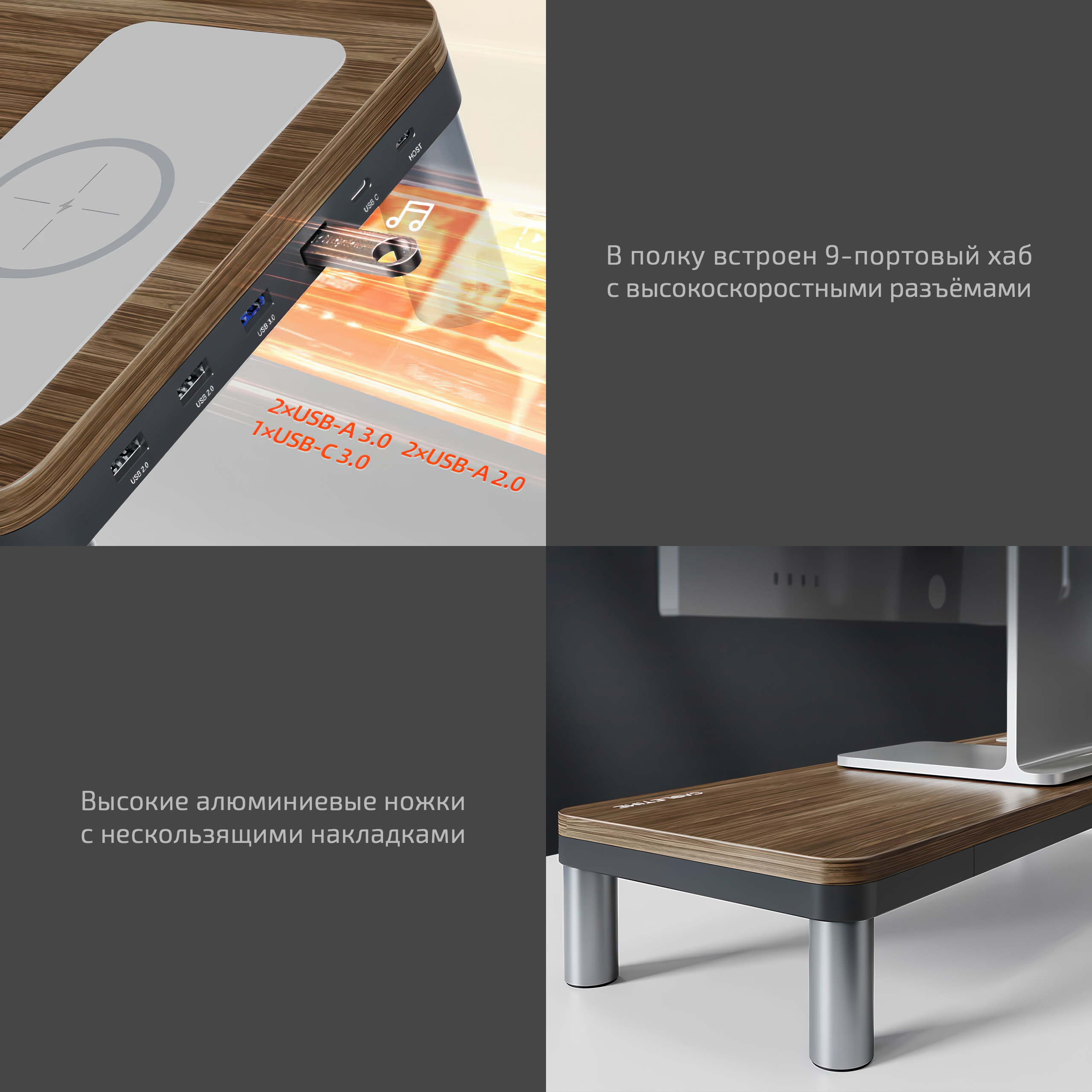 Деревянная подставка-хаб с беспроводной зарядкой CABLETIME для монитора