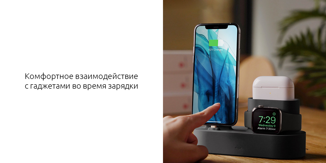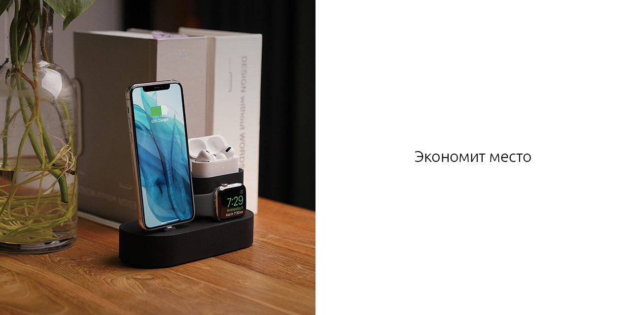 Устройства Apple красивы и лаконичны, но беспорядок из зарядных проводов для всех гаджетов может испортить любое рабочее место. Силиконовая подставка от elago позволит спрятать ненужные кабели и заряжать iPhone, Apple Watch и AirPods Pro вместе, при этом все устройства располагаются под комфортным углом, за счёт чего не нужно снимать телефон с зарядки для ответа на сообщение, а достать наушники можно, не извлекая футляр.