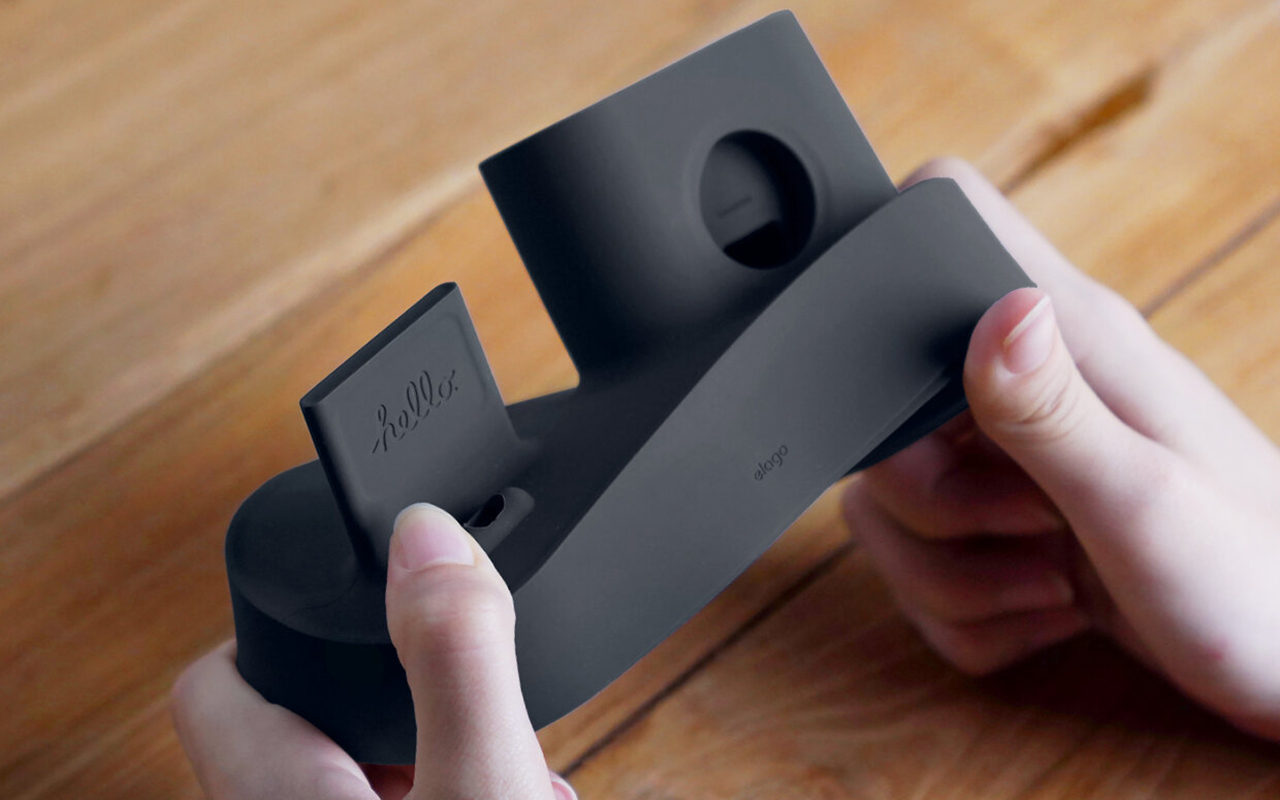 Для производства подставки использован очень качественный мягкий силикон с приятной матовой фактурой. Аксессуар не скользит на большинстве поверхностей, обладая высокой устойчивостью. Внутреннего пространства хватит не только чтобы установить оригинальные зарядные кабели от Apple (в комплект не входят), но и чтобы спрятать излишки проводов, а специальные пазы позволяют надёжно зафиксировать их и точно отрегулировать длину.