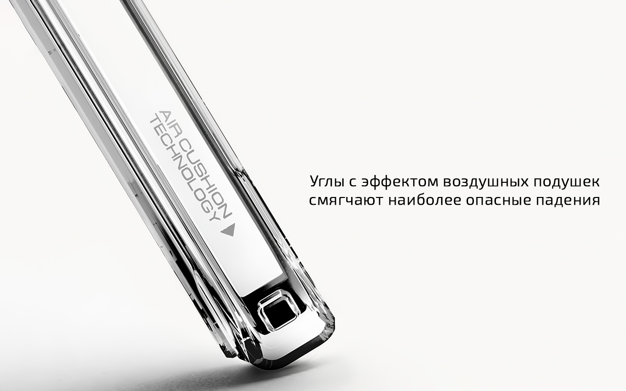 Чехол изготовлен из двух материалов. Жёсткая основа из поликарбоната защищает спинку смартфона от разного рода повреждений, а гибкий бампер из термополиуретана эффективно гасит энергию ударов. Важным элементом безопасности являются специальные воздушные камеры в углах чехла. Они принимают на себя основной удар при падении смартфона на ребро или угол. Для защиты камер и экрана чехол имеет специальные выступающие бортики. В состав материалов чехла введена специальная добавка, которая борется с главным врагом прозрачных аксессуаров – пожелтением.