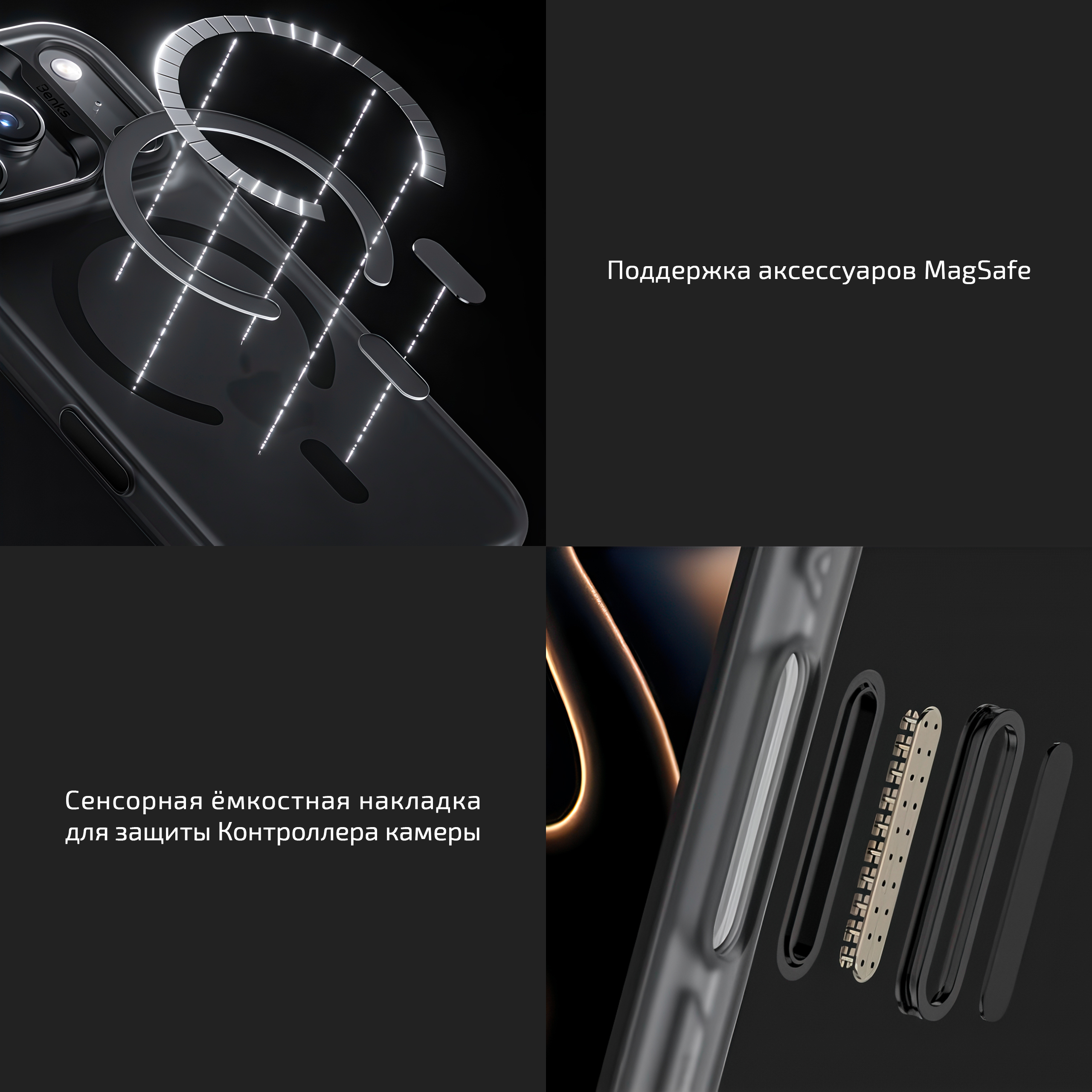 Контроллер камеры – многофункциональная сенсорная область и в этом чехле защита данного элемента iPhone сочетается с сохранением всех его возможностей и возможностью комфортного использовании фирменной фишки, включая управление параметрами съёмки с помощью жестов. Для физических кнопок предусмотрены удобные тактильные накладки.