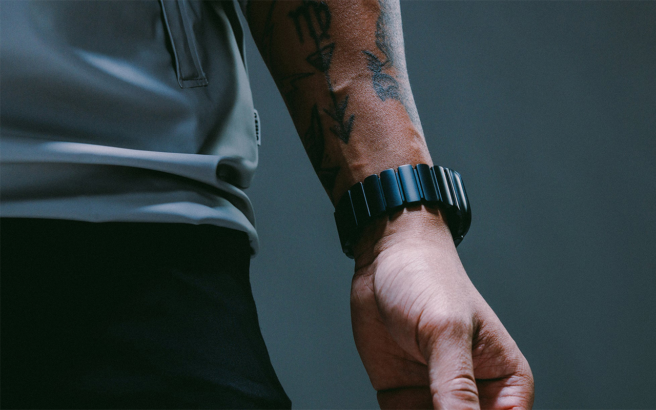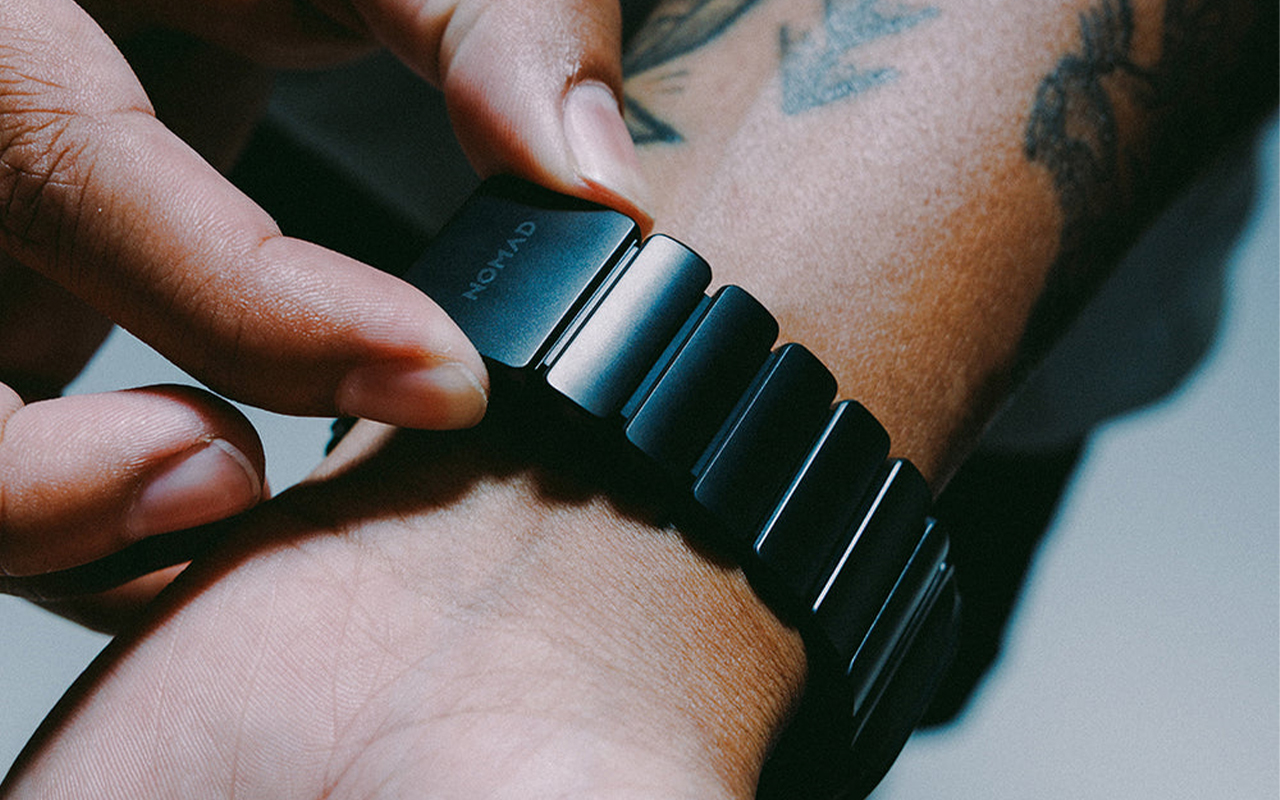 Nomad Stratos Band сочетает в себе прочность классического металлического браслета и гибкость спортивного ремешка благодаря уникальной системе звеньев. Внешние сегменты изготовлены из высокопрочного титана, а внутренние соединительные звенья из фторэластомера. Второй материал позволяет браслету изгибаться и повторять движения запястья, что делает его подходящим для занятий спортом. В то же время верхние металлические звенья придают аксессуару деловой внешний вид. Этот ремешок будет отлично смотреться с классическим костюмом.