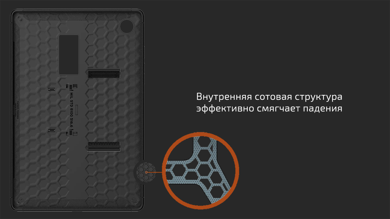 Sсout защищает экран Galaxy Tab выступающей окантовкой, которая не даст стеклу разбиться, если устройство упадёт экраном вниз на ровную поверхность, а также препятствует контакту с частицами пыли и, как следствие – мелким царапинам. Объектив основной камеры защищён выступающим периметром выреза, поэтому поцарапать его случайно – крайне сложно. Сотовая структура задней стенки способствует созданию воздушных полостей, которые эффективно смягчают удары.