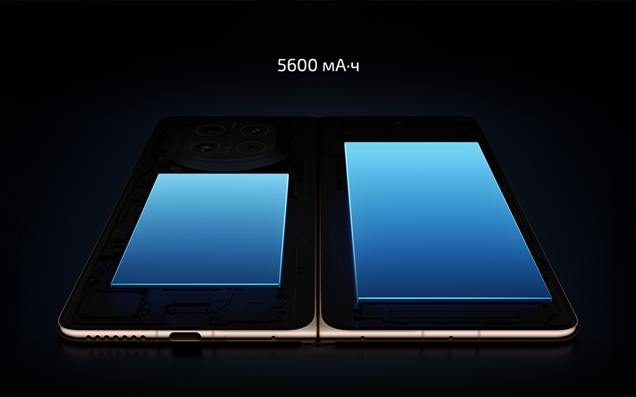 Инженерам удалось разместить в столь тонком корпусе аккумулятор ёмкостью 5600 мАч (батарея состоит из двух ячеек, по одной в каждой половинке смартфона). Девайс может проработать без подзарядки целый рабочий день под умеренными нагрузками. HUAWEI Mate X7 поддерживает быструю проводную зарядку мощностью до 66 Вт. От 0 до 100% батарея заряжается за 45 минут. Отдельно стоит отметить, что адаптер питания идёт в комплекте. А ещё устройство поддерживает беспроводную зарядку мощностью до 50 Вт.
