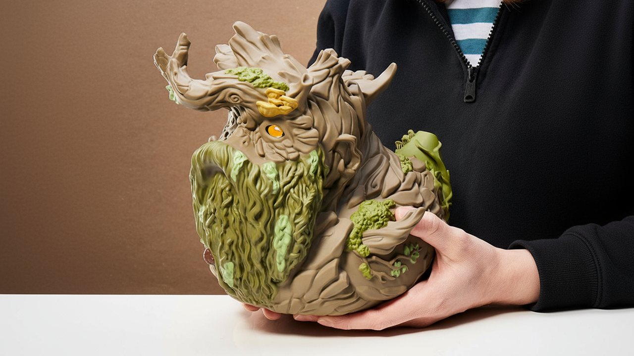 Созданная из прочного и качественного ПВХ, фигурка-утка «Древобород» сохранила узнаваемые черты, хотя и адаптировала их к новому образу. Но даже несмотря на утиный формат, это не водоплавающий экземпляр. Она плохо переносит горячую воду и влажность, потому ванная ей — не место. А вот книжная полка, рабочий стол или полка в коллекционной витрине — как раз то, где Древобород готов поселиться.