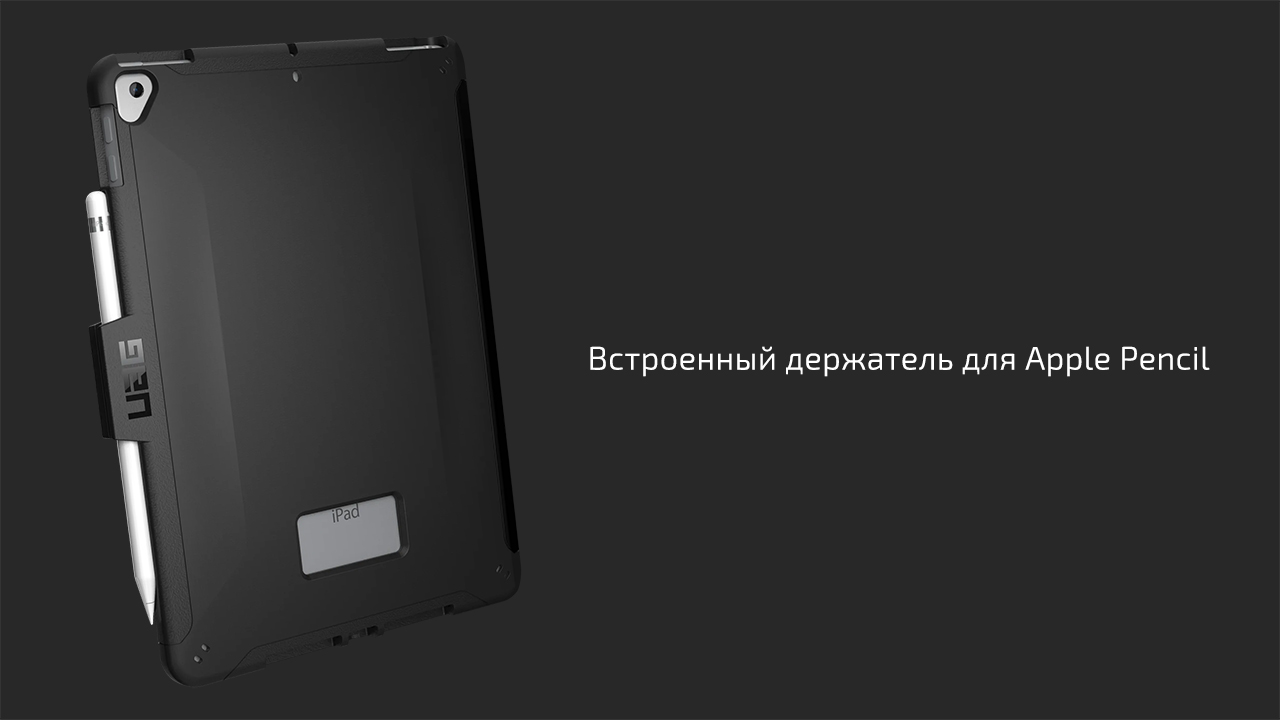 Чехол имеет встроенное крепление для Apple Pencil первого поколения, расположенное таким образом, что достать стилус можно за пару секунд и также легко убрать аксессуар обратно, когда он не нужен. Такое решение приближает пользовательский опыт к профессиональным моделям iPad. Дизайнеры Urban Armor Gear уделили особое внимание практичности, ведь чехол создан для использования в самых разных условиях, поэтому Scout легко протирается обычной влажной салфеткой.