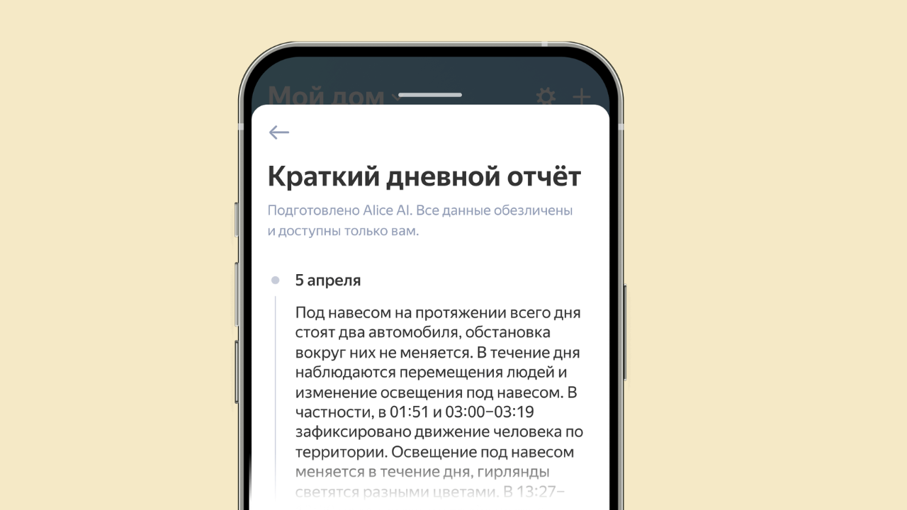 Чтобы не сойти с ума от непрерывного просмотра многочасовых архивов, алгоритмы берут анализ видео на себя. Раз в сутки умная камера будет составлять для вас отчёт о событиях, произошедших за день. Вы получите пуш-уведомление и сможете почитать ёмкое текстовое описание в приложении. Это быстро и безумно удобно. Кроме того, камера всегда держит руку на пульсе: она присылает текстовые уведомления и сообщения с фотографией события, когда фиксирует любое движение или шум, когда целенаправленно замечает человека, отключается от источника питания или переходит в режим приватности. Описания всех событий аккуратно складываются в архив.