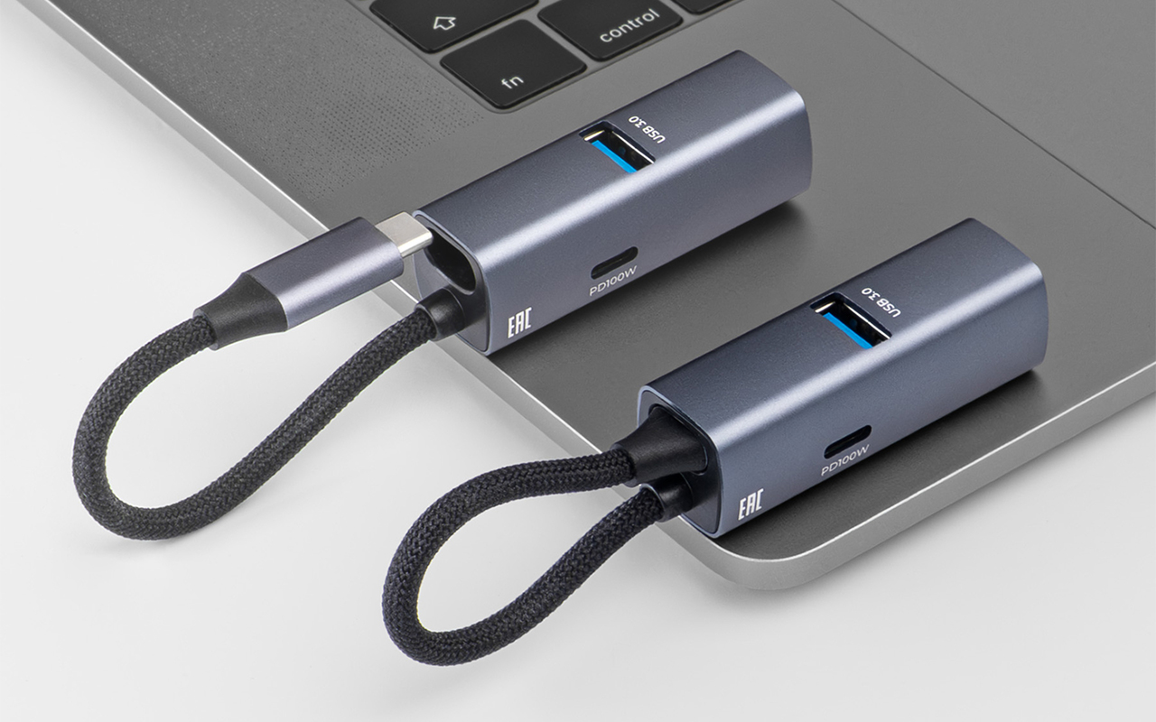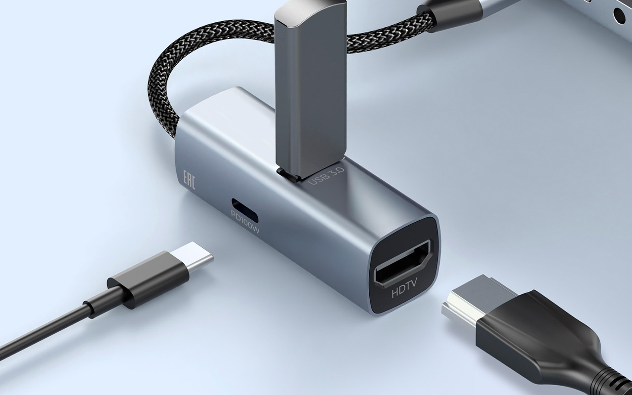 Для быстрого обмена данными предусмотрен скоростной порт USB-A 3.0, поддерживающий передачу файлов на скорости до 5 Гбит/с. При этом можно копировать файлы и одновременно заряжать ноутбук. Хаб имеет USB-C порт с поддержкой технологии Power Delivery, максимальная мощность зарядки 100 Вт. HDMI порт позволяет выводить изображения на мониторы и телевизоры в разрешении 4К при 30 кадрах в секунду.