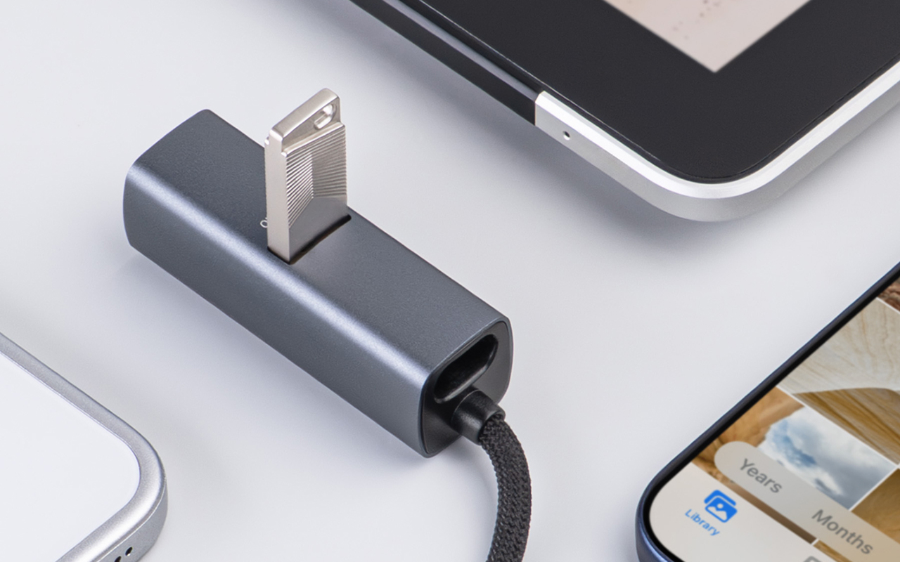 Корпус хаба изготовлен их качественного алюминия. И металл здесь не только для красоты. Алюминий эффективно рассеивает тепло при интенсивно нагрузках на хаб. Встроенный кабель имеет прочную нейлоновую оплётку. Она защищает провод от чрезмерных изгибов и механических повреждений. При этом коннектор кабеля «прячется» в корпусе хаба, что очень удобно. Весит аксессуар всего 28 граммов, его удобно брать с собой куда угодно.