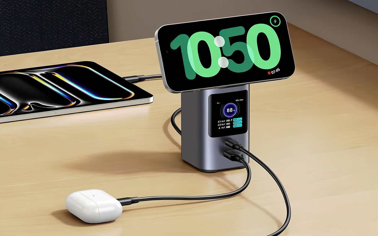 Помимо вышеупомянутой площадки, Ugreen Nexode PB771 имеет и классические порты для проводного подключения самых разнообразных устройств – классический USB-A и 2 современных USB Type C, один из которых способен выдавать до 100 Вт мощности и за считанные минуты воскресить даже севший ноутбук. Суммарная мощность все портов при одновременном использовании может доходить до внушительных 145 Вт! Подробный интерфейс с индикатором заряда и текущим состоянием по каждому используемому порту выводится на встроенный дисплей, а система безопасности автоматически регулирует напряжение и силу тока в зависимости от подключенного устройства.