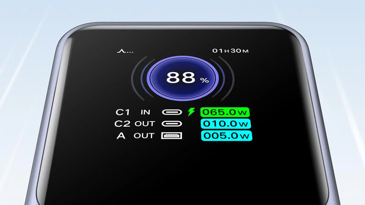 Здесь три выходных разъёма – два USB-C порта и один USB-A. Самый “продвинутый” порт USB-C 1 может работать до 140 Вт, второй – до 100 Вт, а USB-A выдерживает до 22,5 Вт. Корпус сделан добротно: матовый пластик, резиновые ножки, аккуратный дисплей, который показывает заряд, мощность и активные каналы. Есть защита: при нагреве устройство автоматически ограничит мощность – что делает его чуть более консервативным, но безопасным.