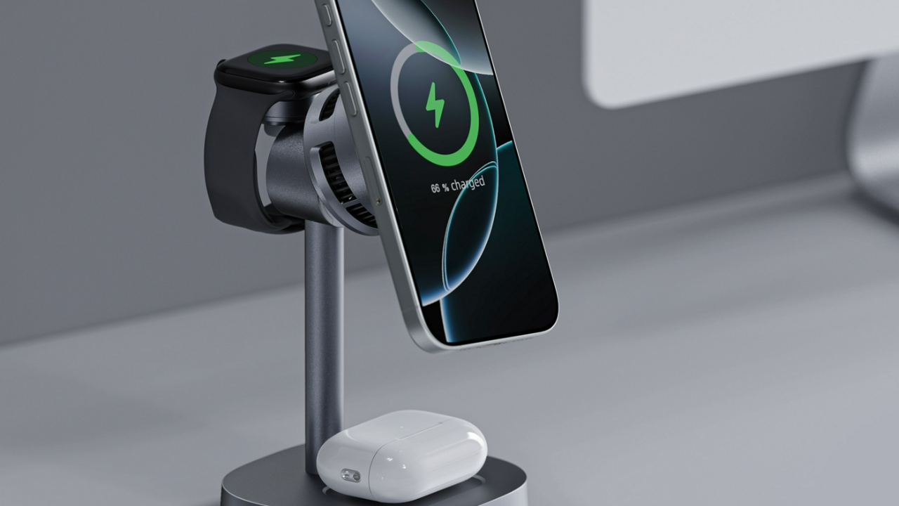 Удобная зарядка должна начинаться не с провода, а с клика. Здесь это реализовано идеально: смартфон фиксируется с помощью магнитного крепления, держится намертво, и его можно поворачивать, чтобы смотреть видео или принимать звонки. База оснащена тремя площадками для всех аппаратов: отдельное место для телефона, площадка для наушников и специальный держатель для часов. Можно просто приложить гаджеты вечером, и наутро вся экосистема будет полностью готова к работе.
